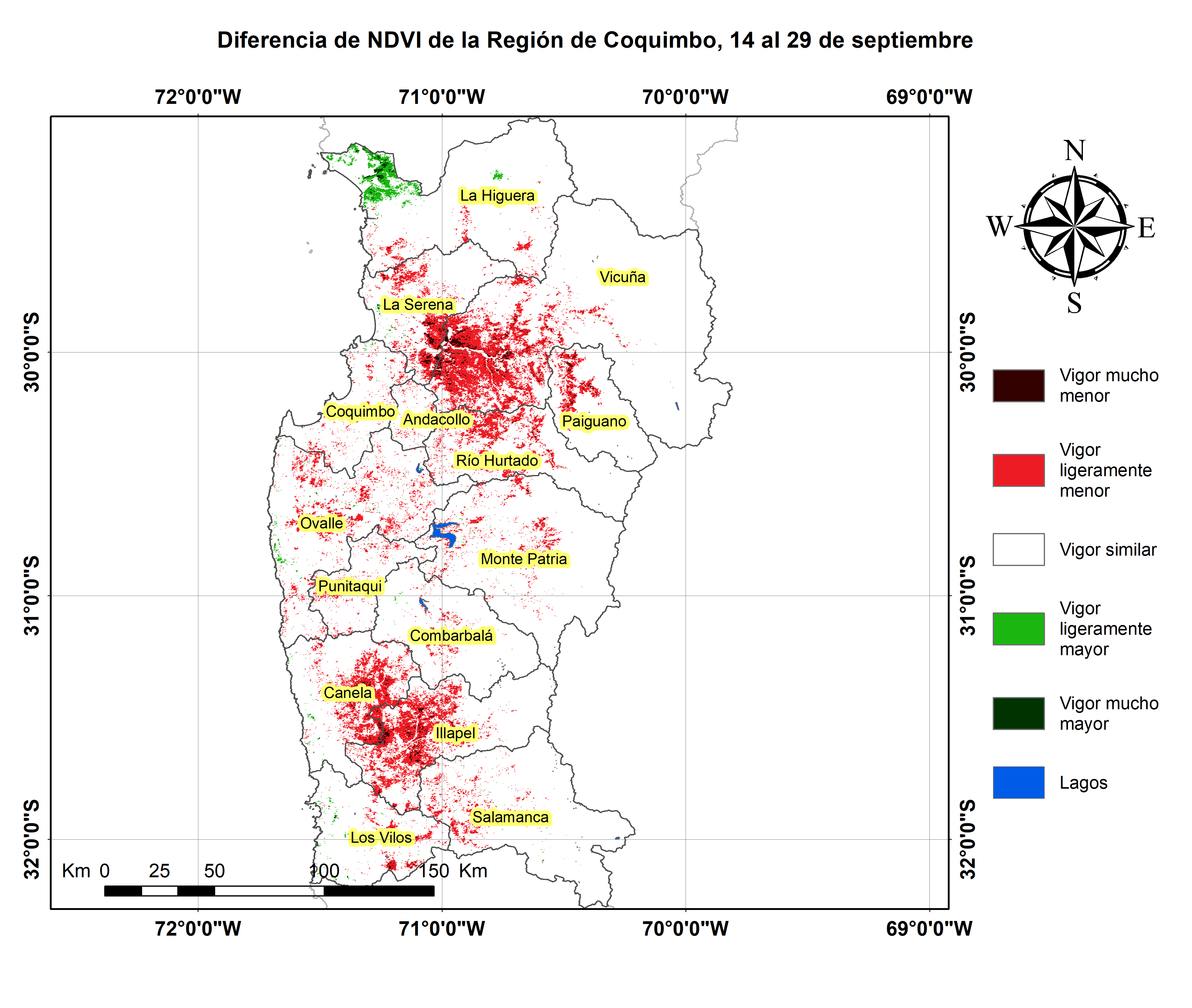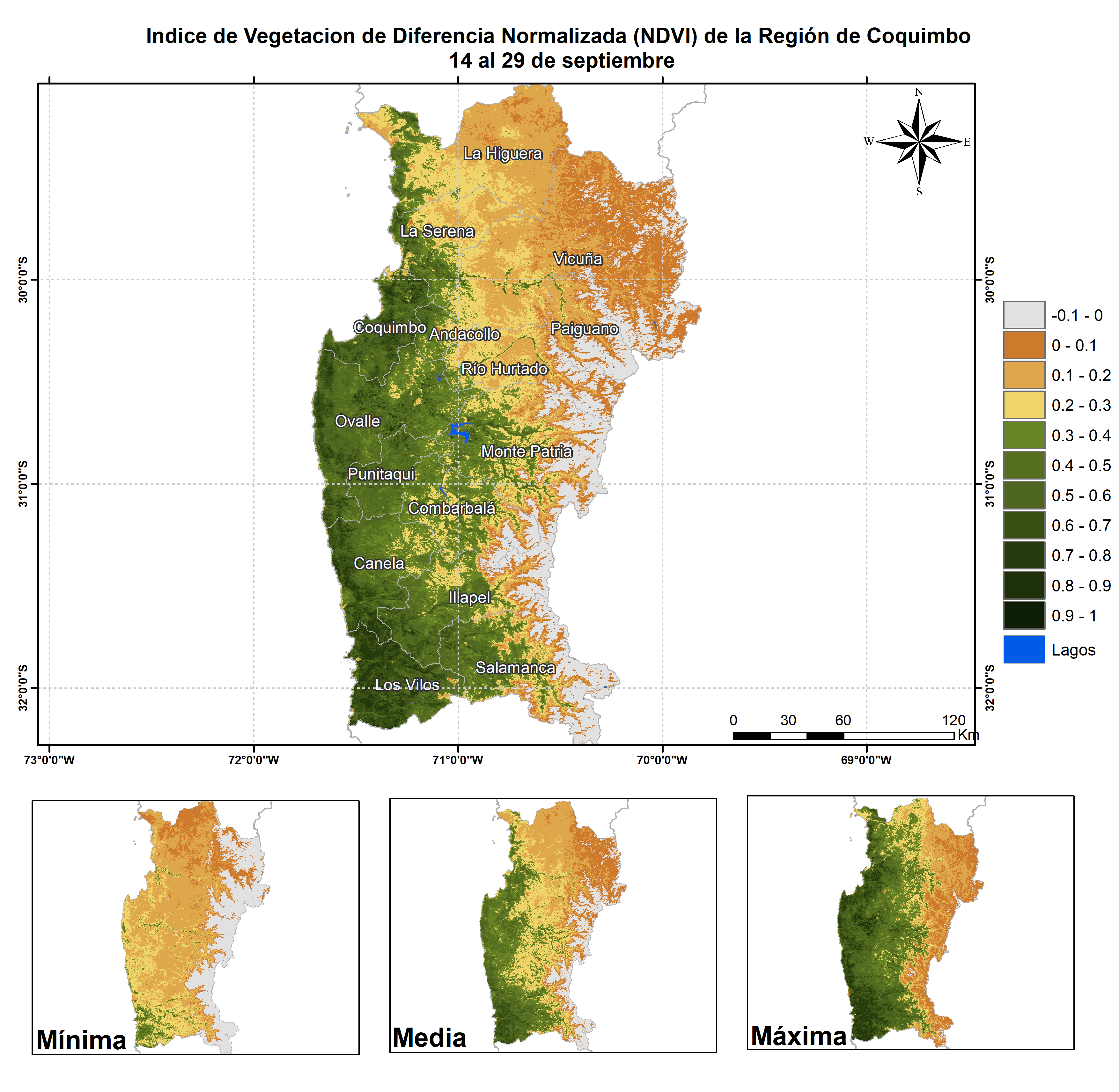 Respecto de la respuesta fisiológica de las plantas al efecto del clima, las imágenes satelitales reflejan la magnitud del crecimiento o disminución de la cobertura vegetal en esta época del año mediante el índice de vegetación NDVI (Desviación Normalizada del Índice de Vegetación).