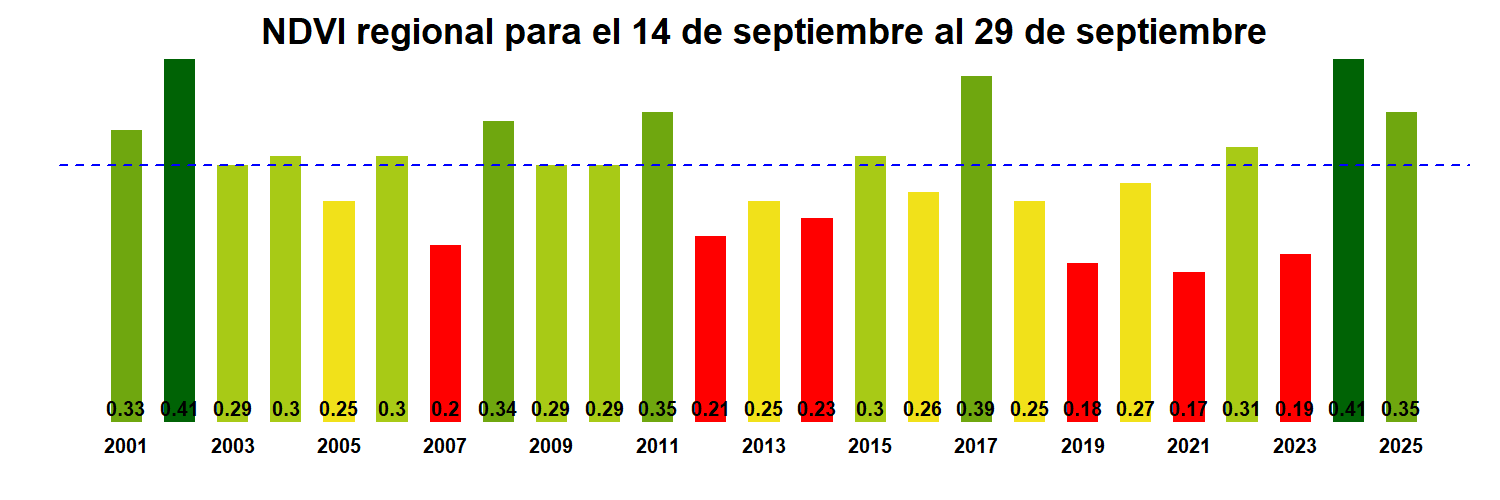 Para esta quincena se observa un NDVI promedio regional de 0.35 mientras el año pasado había sido de 0.41. El valor promedio histórico para esta región, en este período del año es de 0.28.