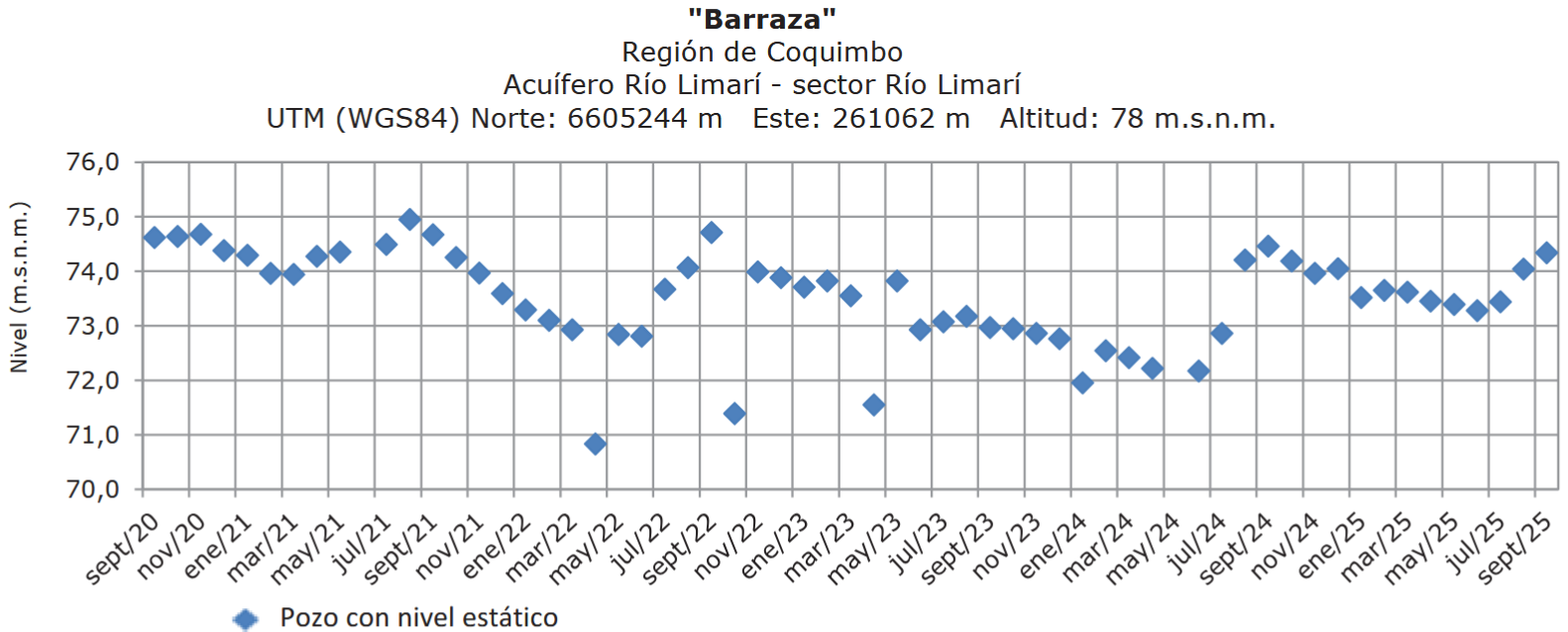 En el pozo Barraza (acuífero Río Limarí, sector Río Limarí), el nivel estático en septiembre se situó en 74,3 m.s.n.m., equivalente a 4 m desde la superficie. Con esto registra un leve aumento con respecto a agosto, con una incipiente recuperación frente a comienzos de año.
