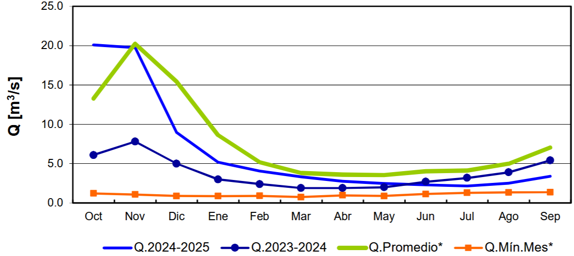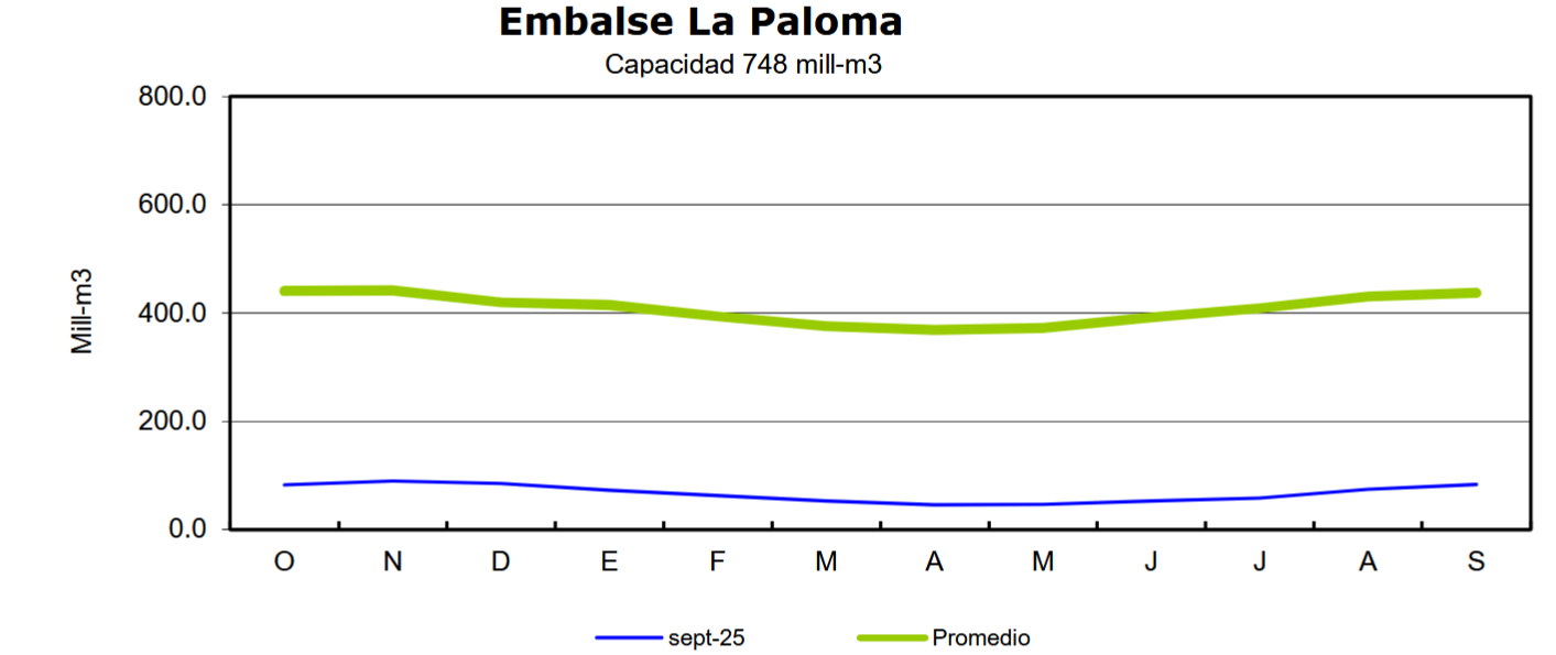 Por otro lado, el embalse La Paloma registró al 30 de septiembre un volumen de 82,9 millones de m3, lo que representa un aumento de 25,4% respecto al mismo mes de 2024 (66,1 millones de m3). Este valor equivale al 19% del promedio histórico mensual (437 millones de m3) y corresponde al 11% de su capacidad total de almacenamiento (750 millones de m3).