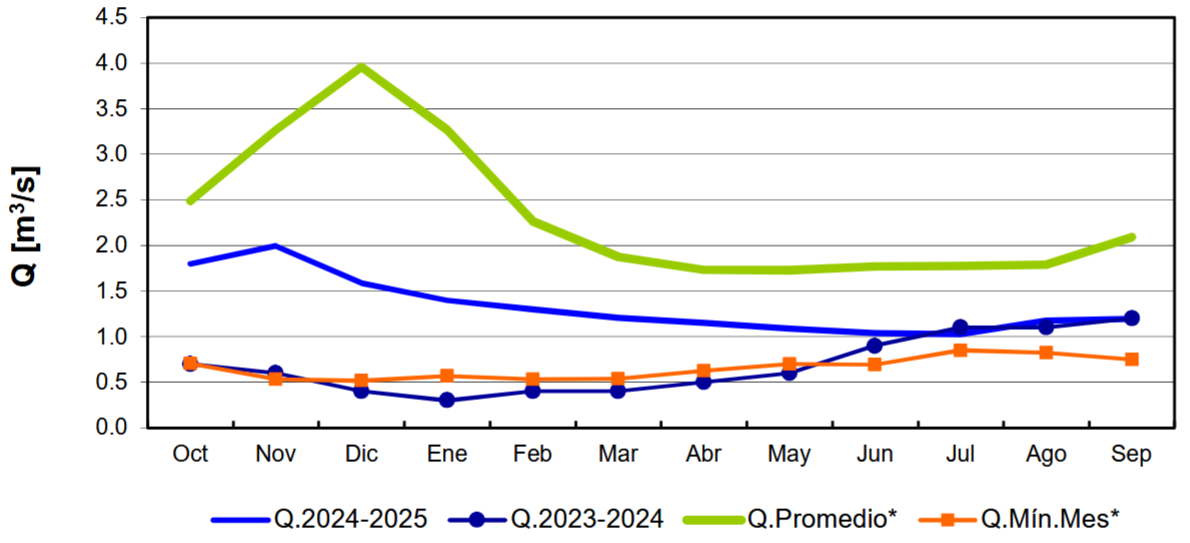 Asimismo, la estación Río Grande en Las Ramadas registró 2,3 m3/s, 39,5% por debajo del promedio histórico (3,8 m3/s) y sin cambios significativos frente a 2024 (2,3 m3/s). En comparación con el mes anterior (1,7 m3/s), aumentó un 35,3%.