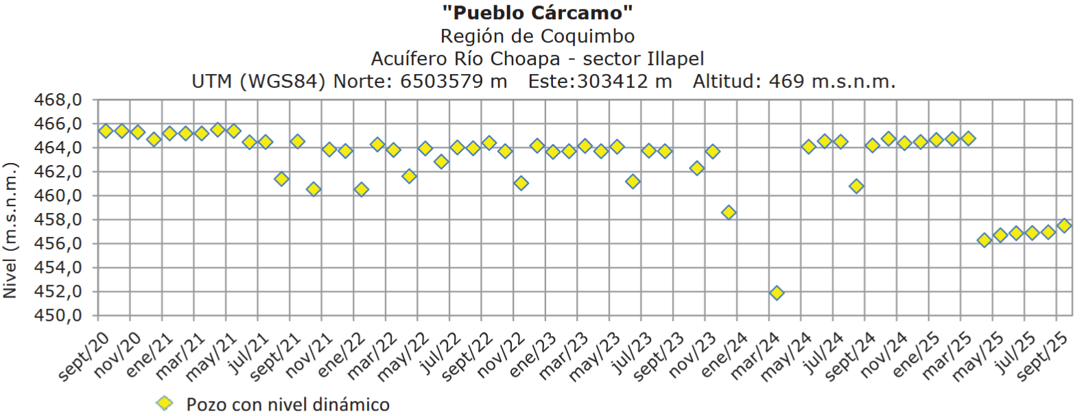 En el sector Illapel, pozo Pueblo Cárcamo (acuífero Río Choapa, sector Illapel) mostró en septiembre un nivel en torno a 457 m.s.n.m., equivalente a 12 m desde la superficie, valor similar al mes previo, aunque se observa un descenso importante desde abril 2025.