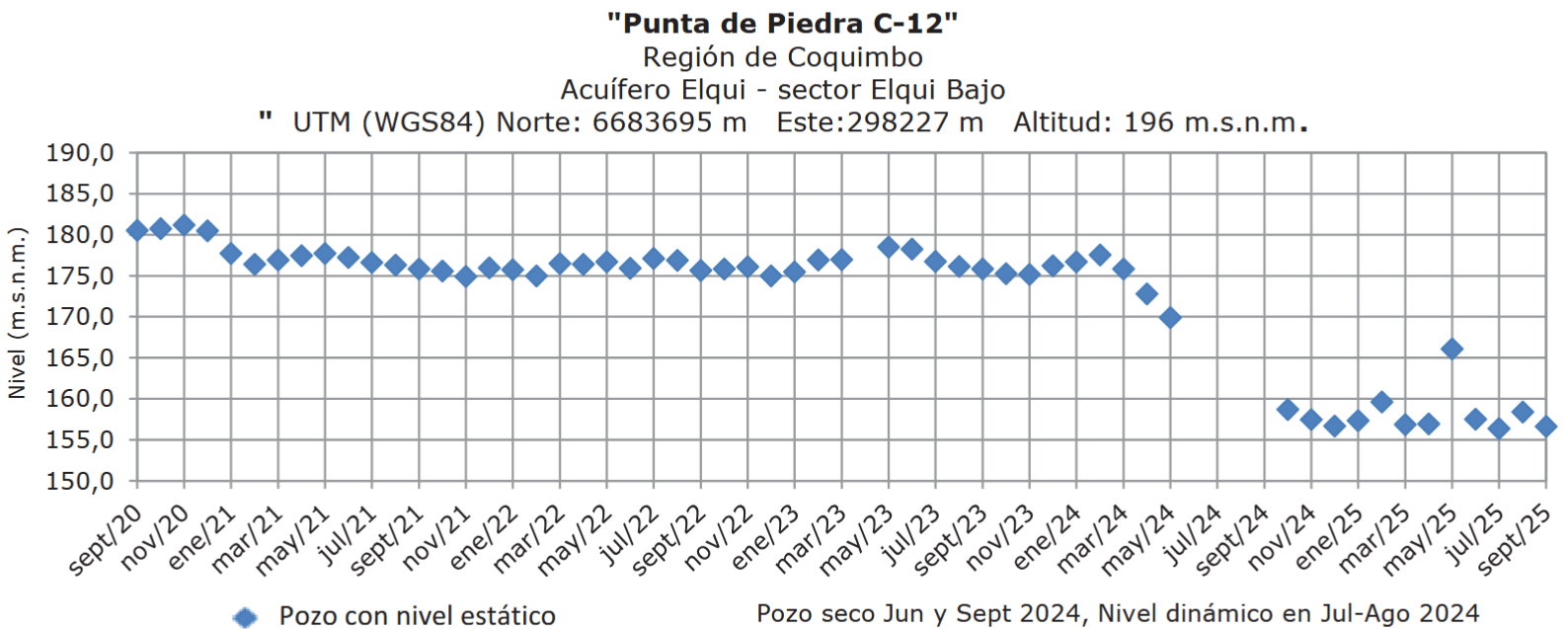El pozo Punta de Piedra (acuífero Elqui, sector Elqui Bajo) registró en septiembre un nivel estático de 156 m.s.n.m., equivalente a 36 m desde la superficie, levemente inferior respecto a julio (158 m.s.n.m.), sin variaciones significativas en los últimos 10 meses.