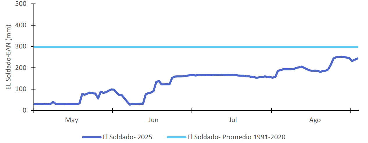 Respecto del manto nival, la serie de El Soldado (Choapa) muestra que el Equivalente de Agua Nieve (EAN) 2025 se mantuvo por debajo del promedio 1991–2020 a lo largo del período de acumulación.