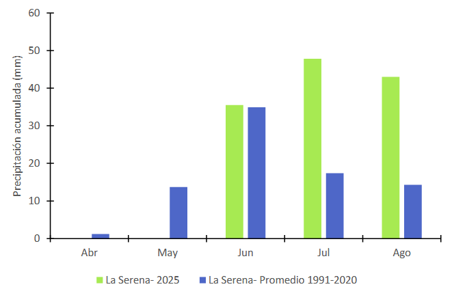 Al analizar el comportamiento de la precipitación acumulada mensual entre abril y agosto de 2025 para la estación de La Serena, se observa que julio y agosto registran valores por sobre el promedio 1991-2020, mientras que abril y mayose ubican por debajo del promedio y mayo levemente sobre la referencia climatológica.