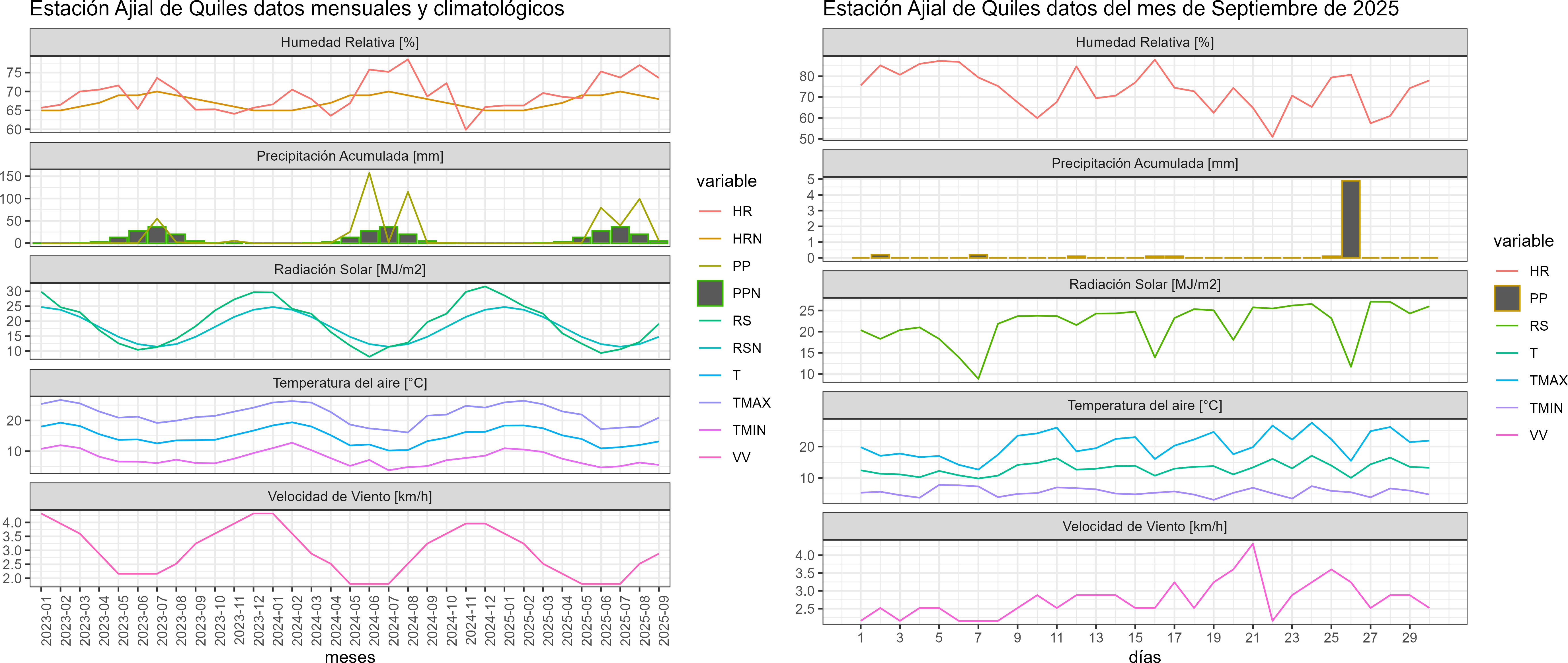 La estación Ajial de Quiles corresponde al distrito agroclimático 3-4-3. Para este distrito climático la temperatura mínima, media y máxima climatológicas alcanzan los 5.9°C, 11.8°C y 17.7°C respectivamente. Por su parte, respecto a las temperaturas medidas durante el mes de septiembre en la estación: la temperatura mínima alcanzo los 5.6°C (-0.3°C bajo la climatológica), la temperatura media 13.1°C (1.3°C sobre la climatológica) y la temperatura máxima llegó a los 20.6°C (2.9°C sobre la climatológica). En el mes de septiembre se registró una pluviometría de 5.7 mm, lo cual representa un 51.8% con respecto al mismo mes de un año normal. De enero a septiembre se ha registrado un total acumulado de 225.9 mm, en circunstancias que un año normal registraría a la fecha 177 mm, lo que representa un superávit de 27.6%. A la misma fecha, durante el año 2024 la precipitación alcanzaba los 0.5 mm.