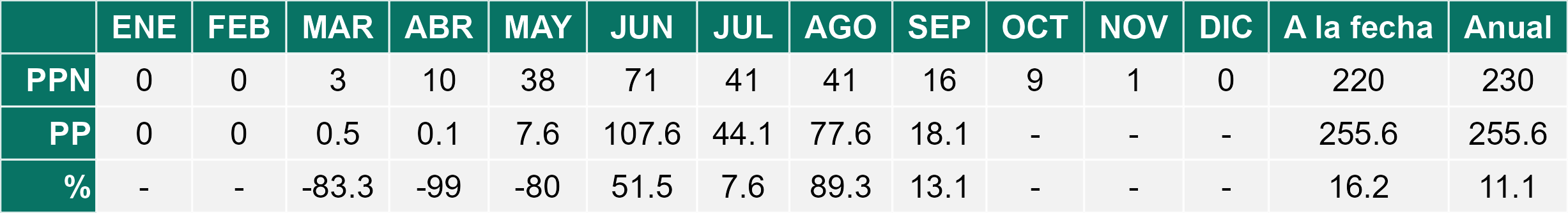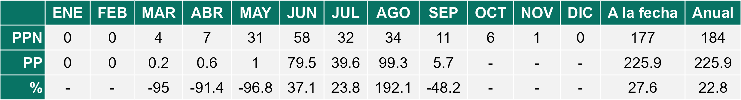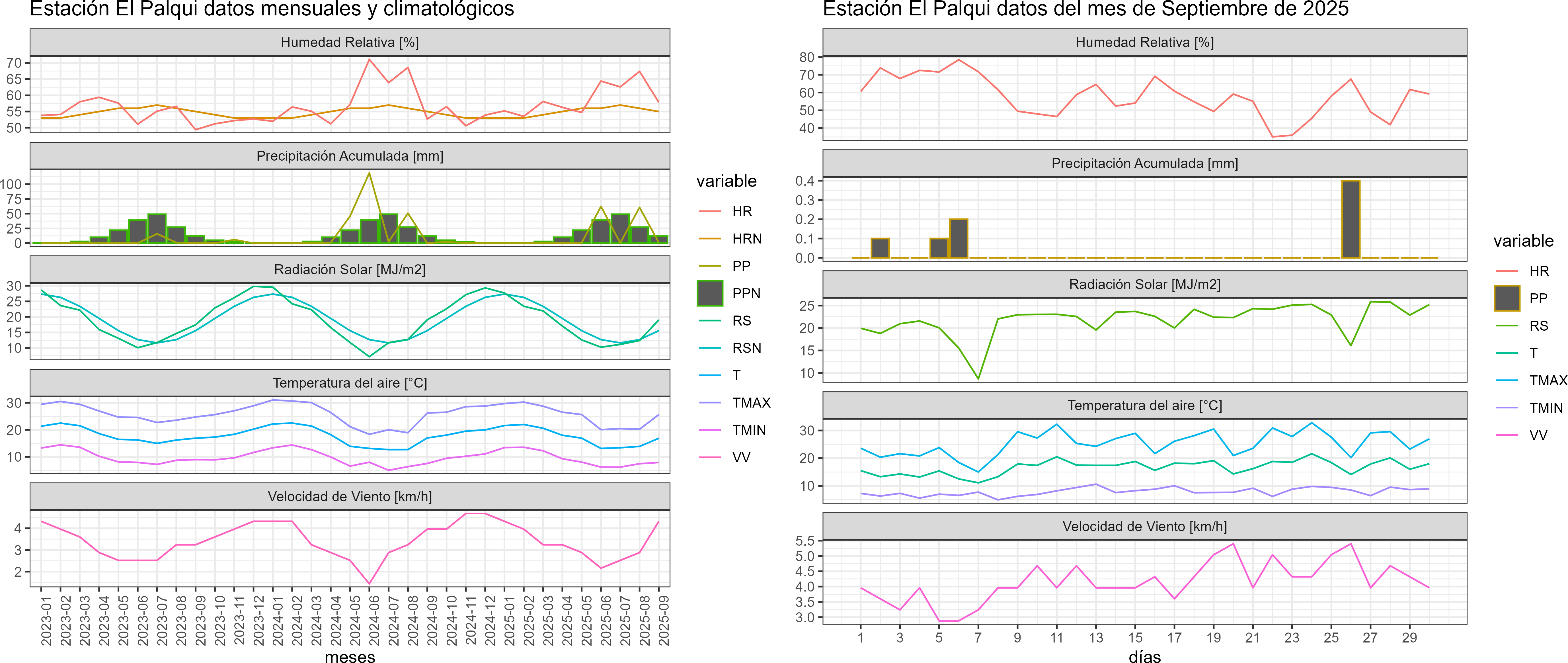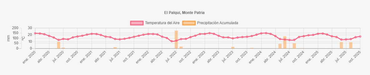 La estación El Palqui corresponde al distrito agroclimático 4-7. Para este distrito climático la temperatura mínima, media y máxima climatológicas alcanzan los 6.9°C, 15.6°C y 24.3°C respectivamente. Por su parte, respecto a las temperaturas medidas durante el mes de septiembre en la estación: la temperatura mínima alcanzo los 7.9°C (1°C sobre la climatológica), la temperatura media 16.7°C (1.1°C sobre la climatológica) y la temperatura máxima llegó a los 25.3°C (1°C sobre la climatológica). En el mes de septiembre se registró una pluviometría de 0.8 mm, lo cual representa un 6.2% con respecto al mismo mes de un año normal. De enero a septiembre se ha registrado un total acumulado de 125 mm, en circunstancias que un año normal registraría a la fecha 170 mm, lo que representa un déficit de 26.5%. A la misma fecha, durante el año 2024 la precipitación alcanzaba los 0 mm.