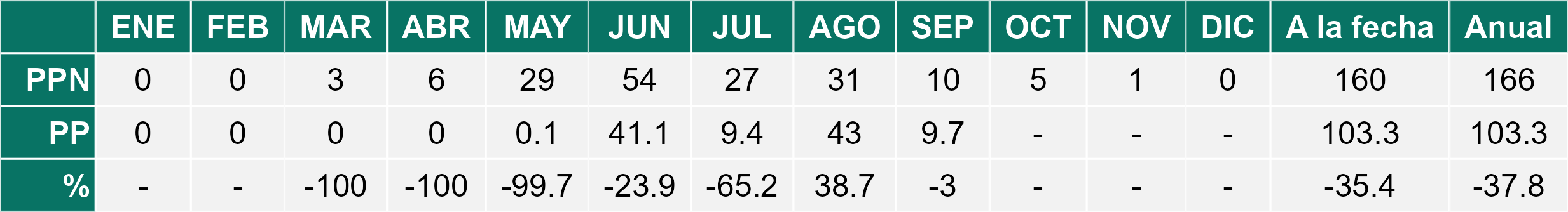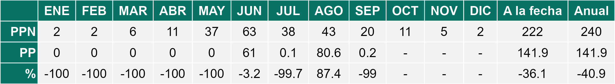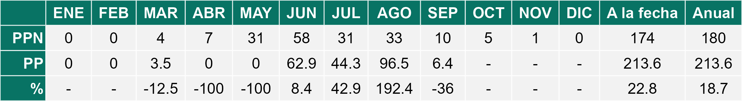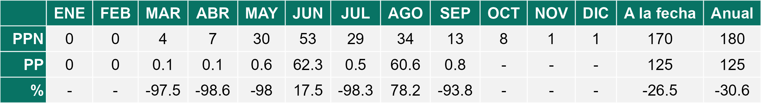 La estación El Palqui corresponde al distrito agroclimático 4-7. Para este distrito climático la temperatura mínima, media y máxima climatológicas alcanzan los 6.9°C, 15.6°C y 24.3°C respectivamente. Por su parte, respecto a las temperaturas medidas durante el mes de septiembre en la estación: la temperatura mínima alcanzo los 7.9°C (1°C sobre la climatológica), la temperatura media 16.7°C (1.1°C sobre la climatológica) y la temperatura máxima llegó a los 25.3°C (1°C sobre la climatológica). En el mes de septiembre se registró una pluviometría de 0.8 mm, lo cual representa un 6.2% con respecto al mismo mes de un año normal. De enero a septiembre se ha registrado un total acumulado de 125 mm, en circunstancias que un año normal registraría a la fecha 170 mm, lo que representa un déficit de 26.5%. A la misma fecha, durante el año 2024 la precipitación alcanzaba los 0 mm.