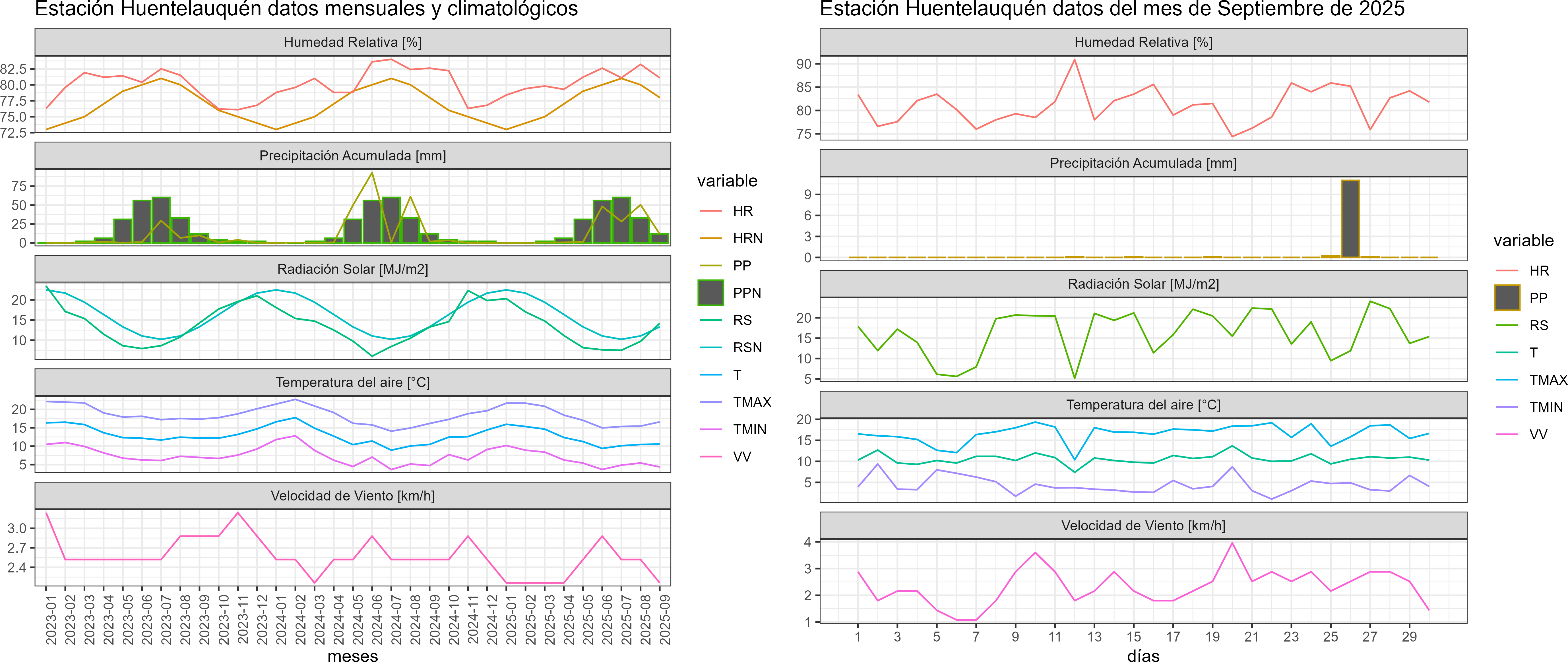 La estación Huentelauquén corresponde al distrito agroclimático 4-1. Para este distrito climático la temperatura mínima, media y máxima climatológicas alcanzan los 7.4°C, 11.9°C y 16.4°C respectivamente. Por su parte, respecto a las temperaturas medidas durante el mes de septiembre en la estación: la temperatura mínima alcanzo los 4.4°C (-3°C bajo la climatológica), la temperatura media 10.6°C (-1.3°C bajo la climatológica) y la temperatura máxima llegó a los 16.6°C (0.2°C sobre la climatológica). En el mes de septiembre se registró una pluviometría de 11.6 mm, lo cual representa un 116% con respecto al mismo mes de un año normal. De enero a septiembre se ha registrado un total acumulado de 140.6 mm, en circunstancias que un año normal registraría a la fecha 151 mm, lo que representa un déficit de 6.9%. A la misma fecha, durante el año 2024 la precipitación alcanzaba los 1.8 mm.