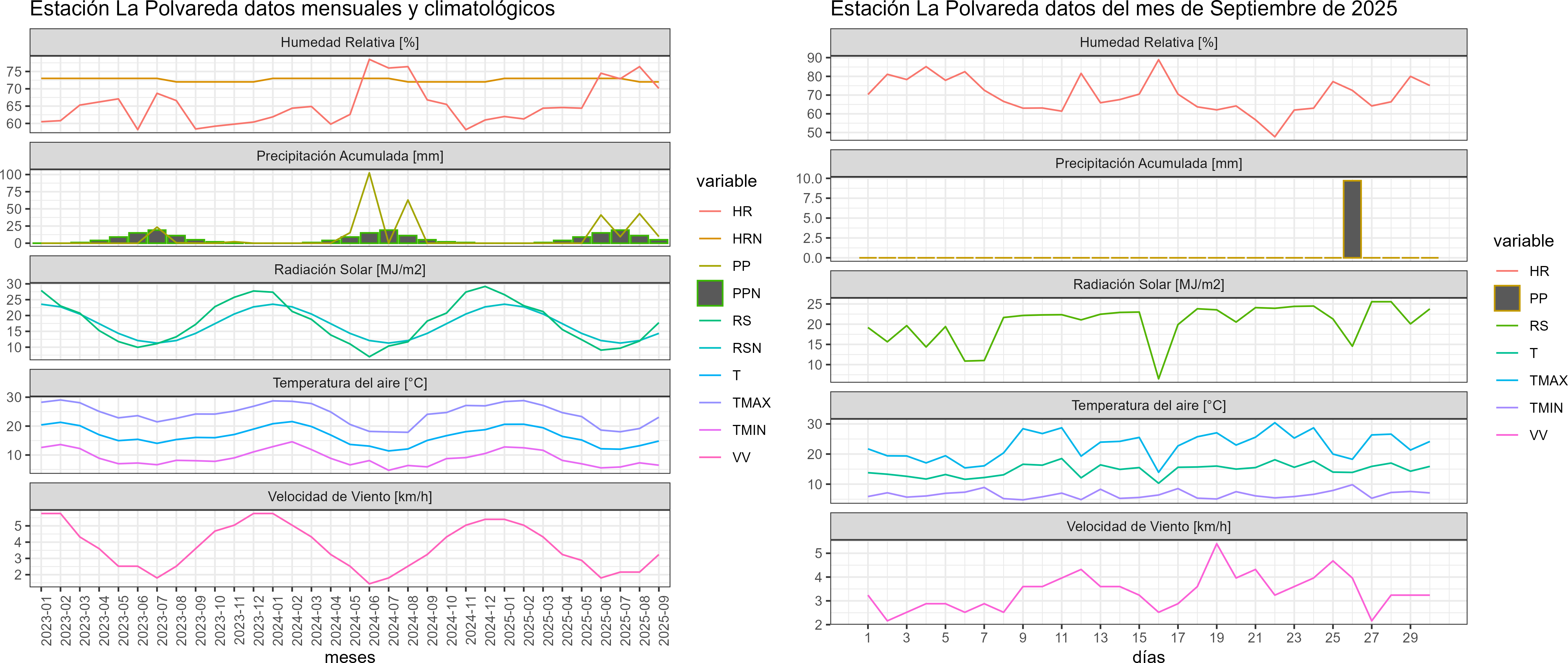 La estación La Polvareda corresponde al distrito agroclimático 3-4-2. Para este distrito climático la temperatura mínima, media y máxima climatológicas alcanzan los 6.3°C, 13.9°C y 21.5°C respectivamente. Por su parte, respecto a las temperaturas medidas durante el mes de septiembre en la estación: la temperatura mínima alcanzo los 6.6°C (0.3°C sobre la climatológica), la temperatura media 14.7°C (0.8°C sobre la climatológica) y la temperatura máxima llegó a los 22.8°C (1.3°C sobre la climatológica). En el mes de septiembre se registró una pluviometría de 9.7 mm, lo cual representa un 97% con respecto al mismo mes de un año normal. De enero a septiembre se ha registrado un total acumulado de 103.3 mm, en circunstancias que un año normal registraría a la fecha 160 mm, lo que representa un déficit de 35.4%. A la misma fecha, durante el año 2024 la precipitación alcanzaba los 0 mm.