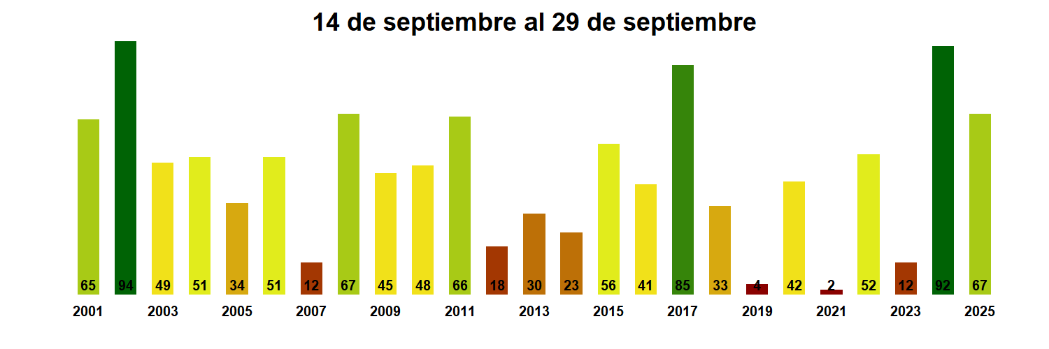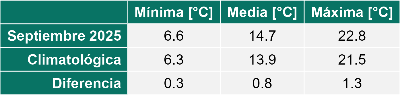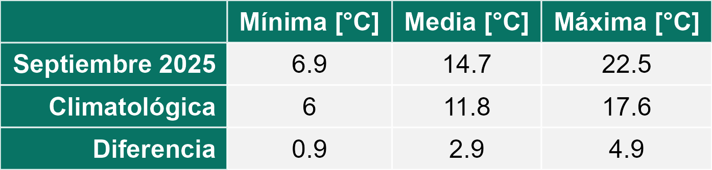 La estación Las Naranjas corresponde al distrito agroclimático 3-4-3. Para este distrito climático la temperatura mínima, media y máxima climatológicas alcanzan los 6°C, 11.8°C y 17.6°C respectivamente. Por su parte, respecto a las temperaturas medidas durante el mes de septiembre en la estación: la temperatura mínima alcanzo los 6.9°C (0.9°C sobre la climatológica), la temperatura media 14.7°C (2.9°C sobre la climatológica) y la temperatura máxima llegó a los 22.5°C (4.9°C sobre la climatológica). En el mes de septiembre se registró una pluviometría de 6.4 mm, lo cual representa un 64% con respecto al mismo mes de un año normal. De enero a septiembre se ha registrado un total acumulado de 213.6 mm, en circunstancias que un año normal registraría a la fecha 174 mm, lo que representa un superávit de 22.8%. A la misma fecha, durante el año 2024 la precipitación alcanzaba los 0.1 mm.
