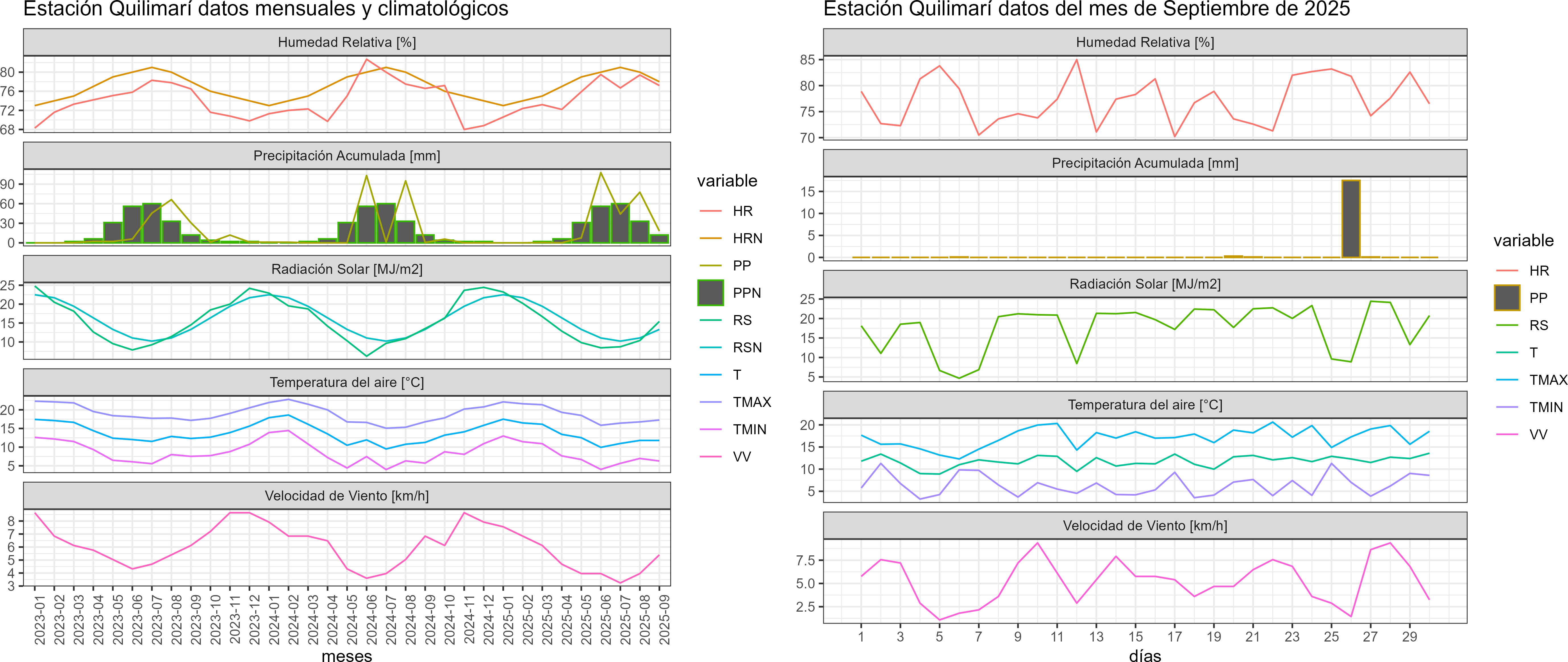 La estación Quilimarí corresponde al distrito agroclimático 4-1. Para este distrito climático la temperatura mínima, media y máxima climatológicas alcanzan los 7.1°C, 11.9°C y 16.7°C respectivamente. Por su parte, respecto a las temperaturas medidas durante el mes de septiembre en la estación: la temperatura mínima alcanzo los 6.4°C (-0.7°C bajo la climatológica), la temperatura media 11.8°C (-0.1°C bajo la climatológica) y la temperatura máxima llegó a los 17.2°C (0.5°C sobre la climatológica). En el mes de septiembre se registró una pluviometría de 18.1 mm, lo cual representa un 113.1% con respecto al mismo mes de un año normal. De enero a septiembre se ha registrado un total acumulado de 255.6 mm, en circunstancias que un año normal registraría a la fecha 220 mm, lo que representa un superávit de 16.2%. A la misma fecha, durante el año 2024 la precipitación alcanzaba los 0.6 mm.