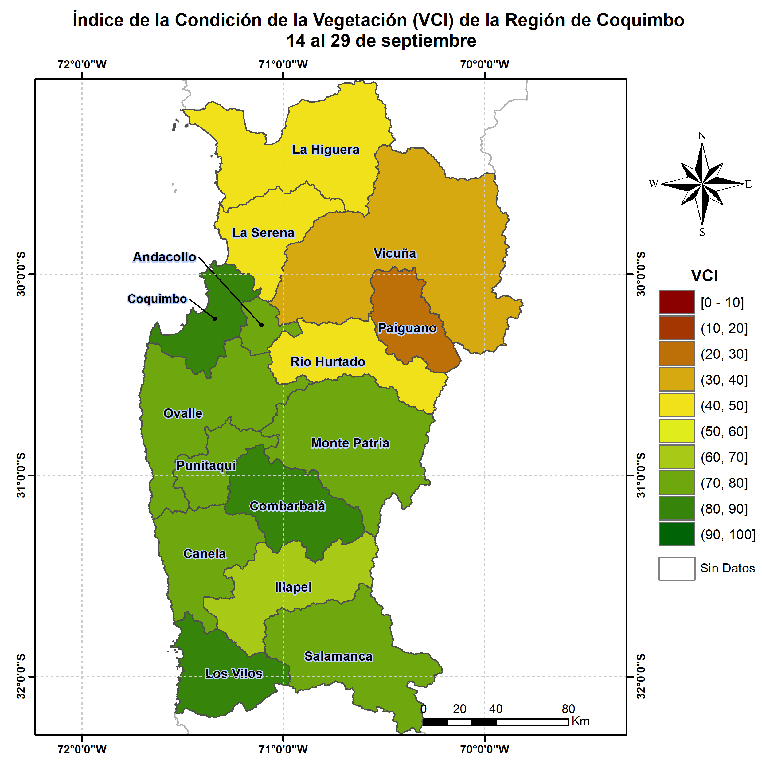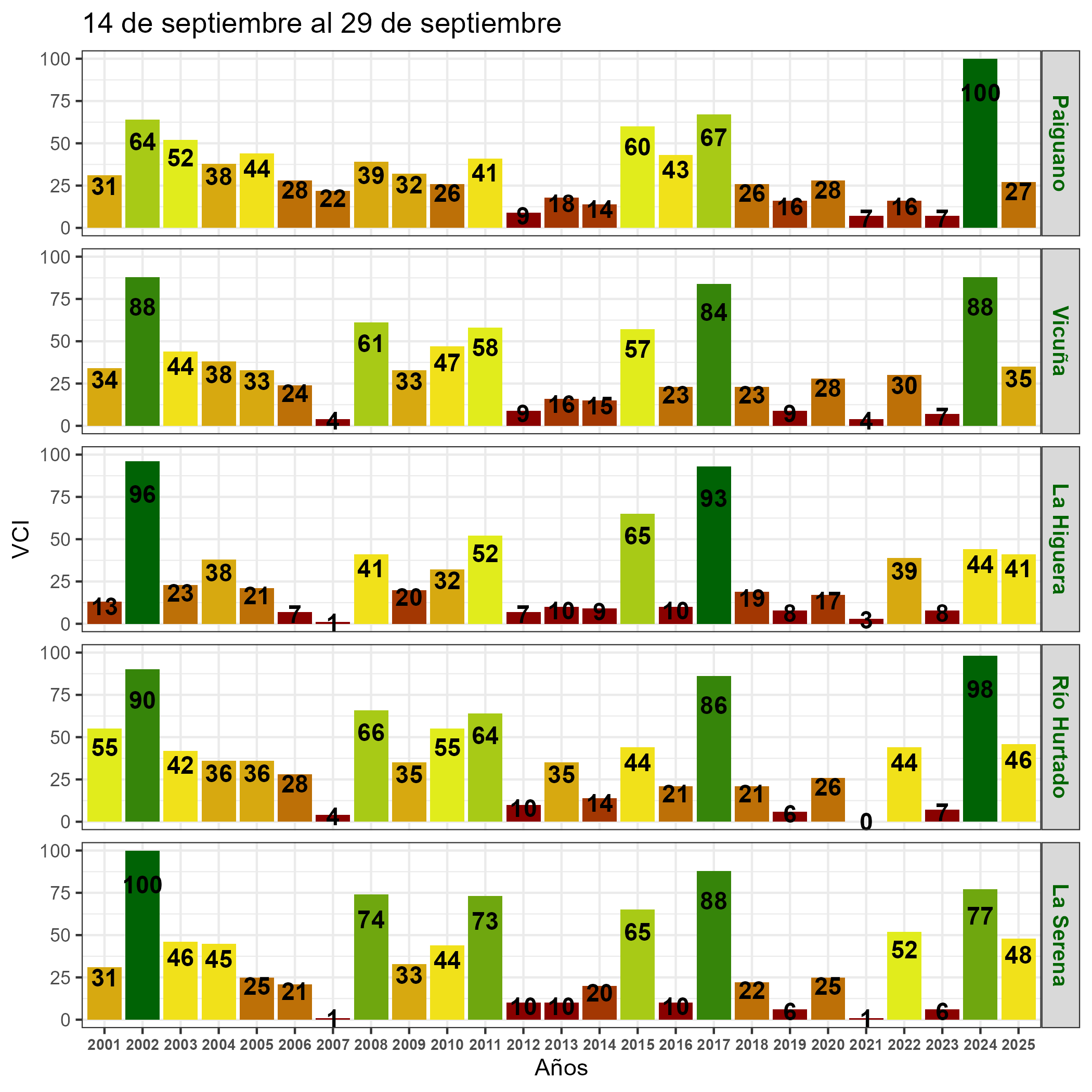 En términos globales la Región presentó un valor mediano de VCI de 67% para el período comprendido desde el 14 al 29 de septiembre. A igual período del año pasado presentaba un VCI de 92% (Fig. 1). De acuerdo a la Tabla 1 la Región de Coquimbo, en términos globales presenta una condición Favorable.