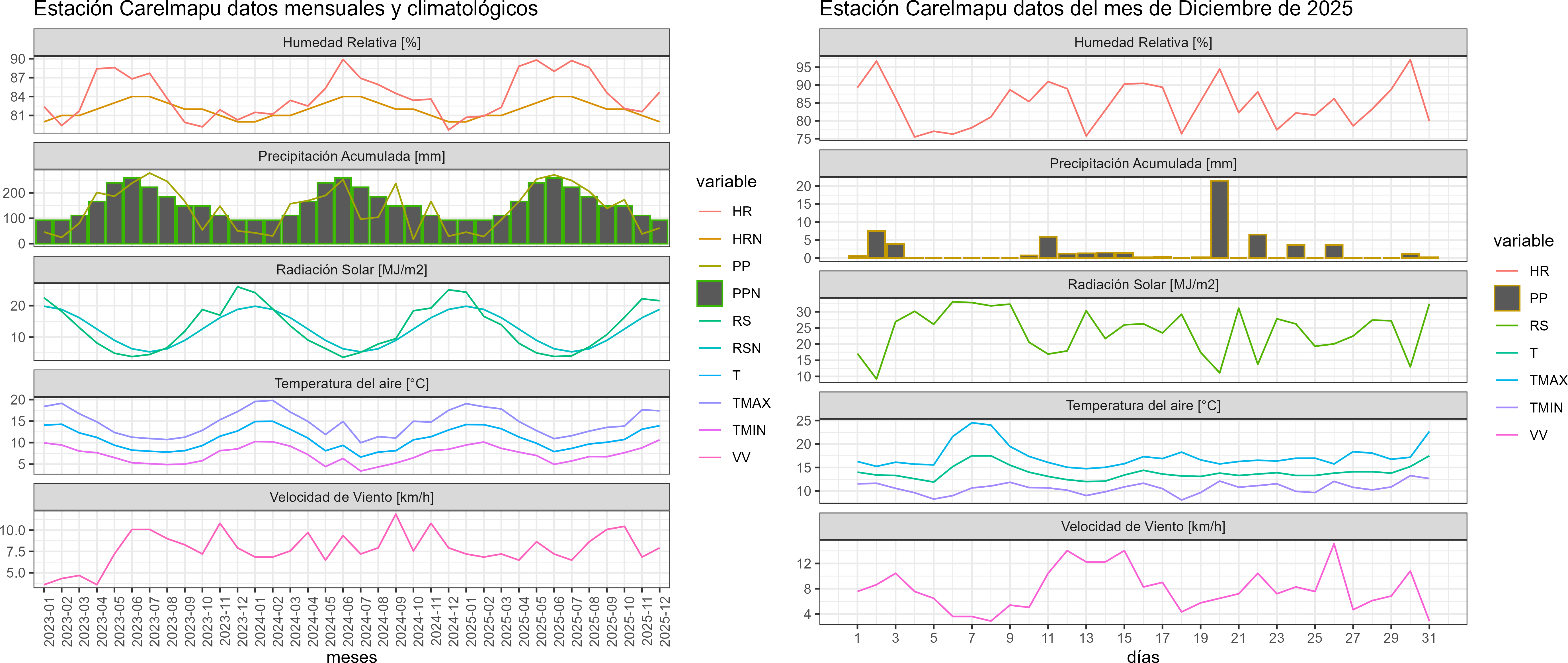 La estación Carelmapu corresponde al distrito agroclimático 14-10-3. Para este distrito climático la temperatura mínima, media y máxima climatológicas alcanzan los 9.1°C, 13.5°C y 17.8°C respectivamente. Por su parte, respecto a las temperaturas medidas durante el mes de diciembre en la estación: la temperatura mínima alcanzo los 10.7°C (1.6°C sobre la climatológica), la temperatura media 13.9°C (0.4°C sobre la climatológica) y la temperatura máxima llegó a los 17.4°C (-0.4°C bajo la climatológica). En el mes de diciembre se registró una pluviometría de 61.5 mm, lo cual representa un 75.9% con respecto al mismo mes de un año normal. De enero a diciembre se ha registrado un total acumulado de 1724.7 mm, en circunstancias que un año normal registraría a la fecha 1716 mm, lo que representa un superávit de 0.5%. A la misma fecha, durante el año 2024 la precipitación alcanzaba los 29.5 mm.