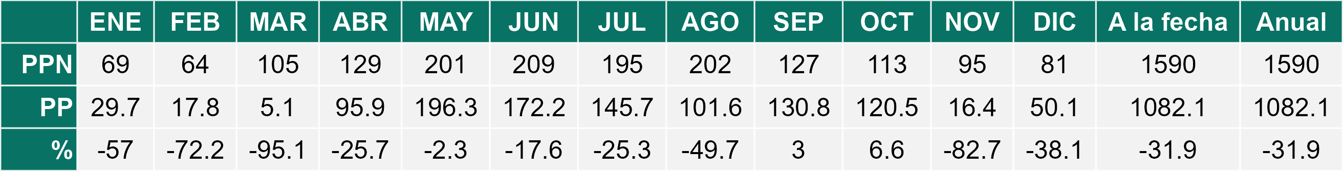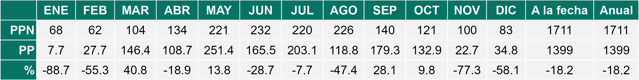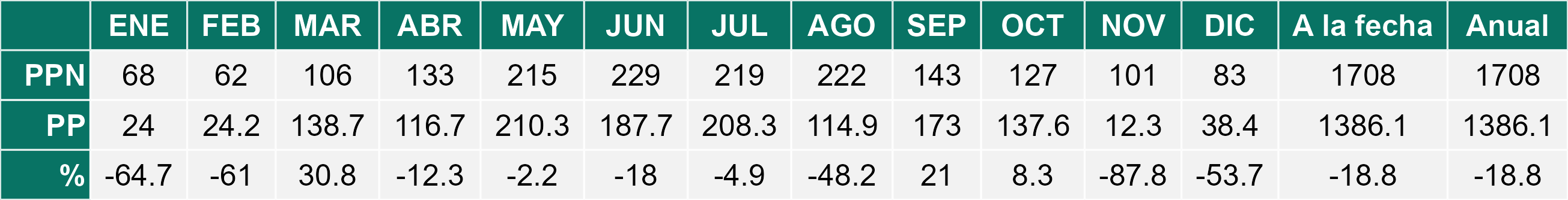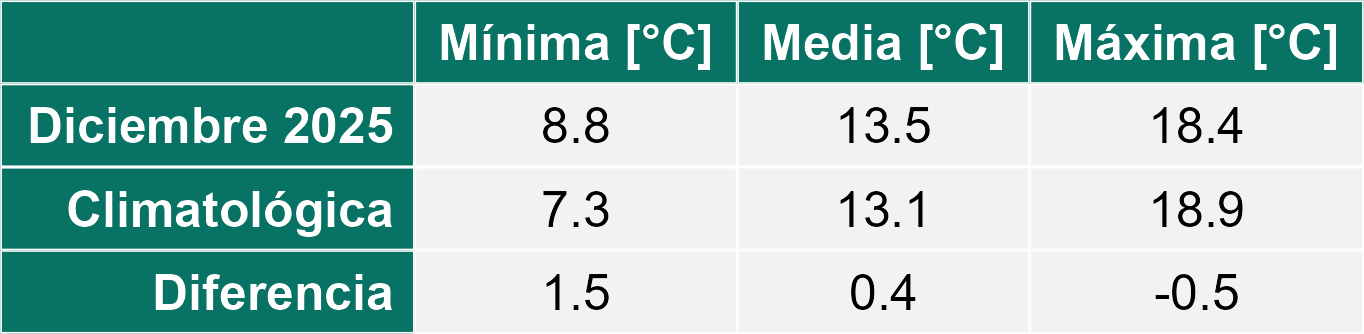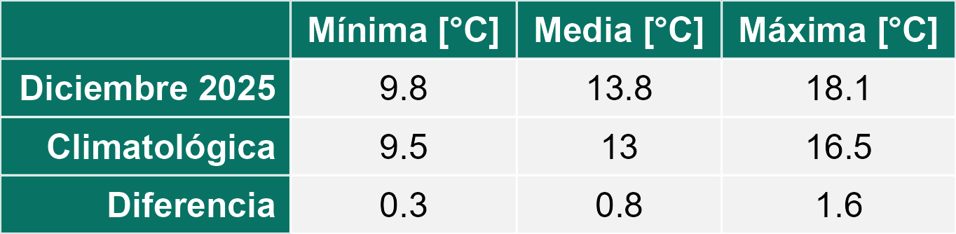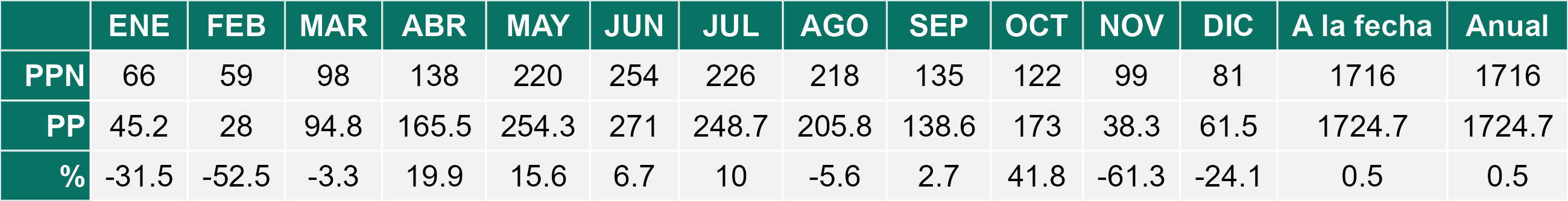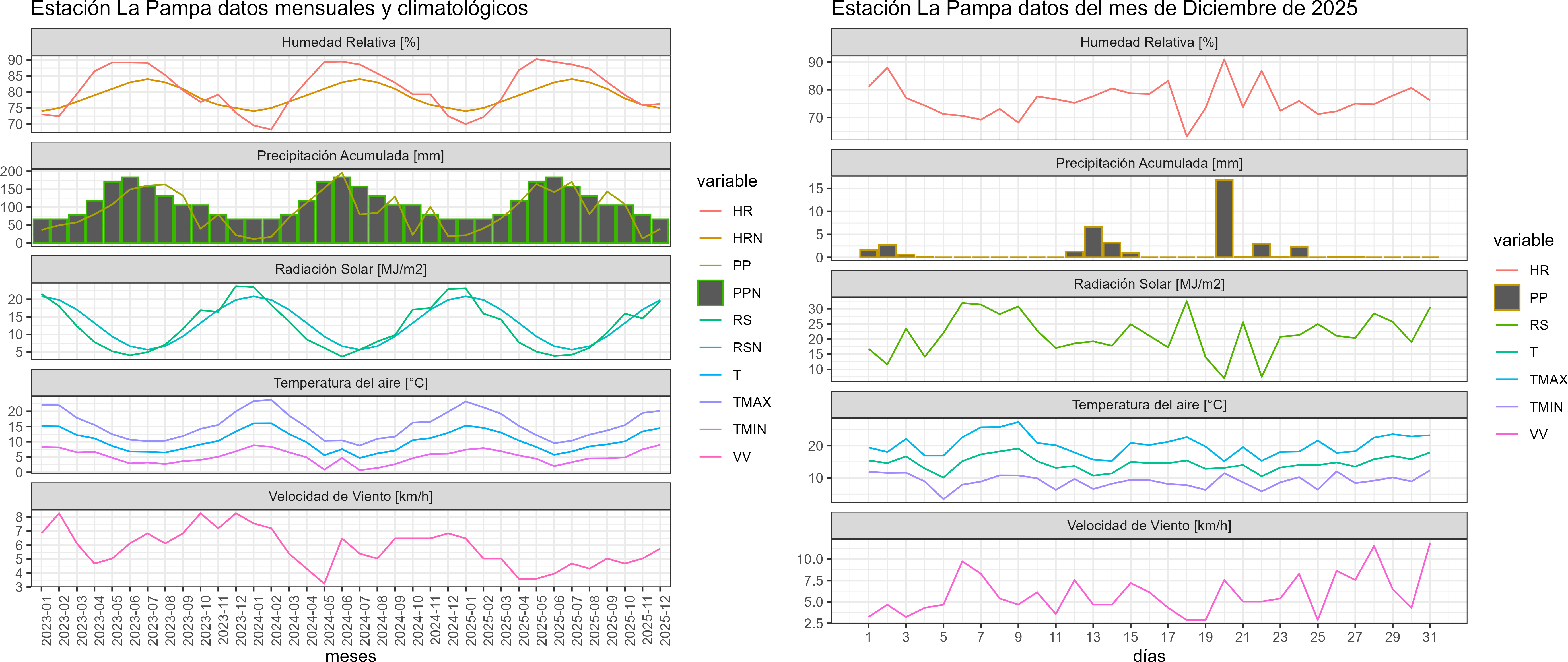 La estación La Pampa corresponde al distrito agroclimático 14-10-2. Para este distrito climático la temperatura mínima, media y máxima climatológicas alcanzan los 7.9°C, 14.2°C y 20.5°C respectivamente. Por su parte, respecto a las temperaturas medidas durante el mes de diciembre en la estación: la temperatura mínima alcanzo los 9°C (1.1°C sobre la climatológica), la temperatura media 14.5°C (0.3°C sobre la climatológica) y la temperatura máxima llegó a los 20.2°C (-0.3°C bajo la climatológica). En el mes de diciembre se registró una pluviometría de 39.6 mm, lo cual representa un 58.2% con respecto al mismo mes de un año normal. De enero a diciembre se ha registrado un total acumulado de 1103.3 mm, en circunstancias que un año normal registraría a la fecha 1549 mm, lo que representa un déficit de 28.8%. A la misma fecha, durante el año 2024 la precipitación alcanzaba los 19.3 mm.