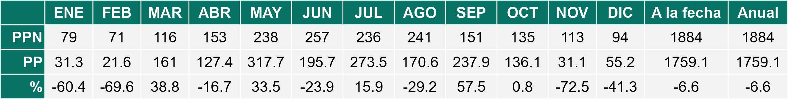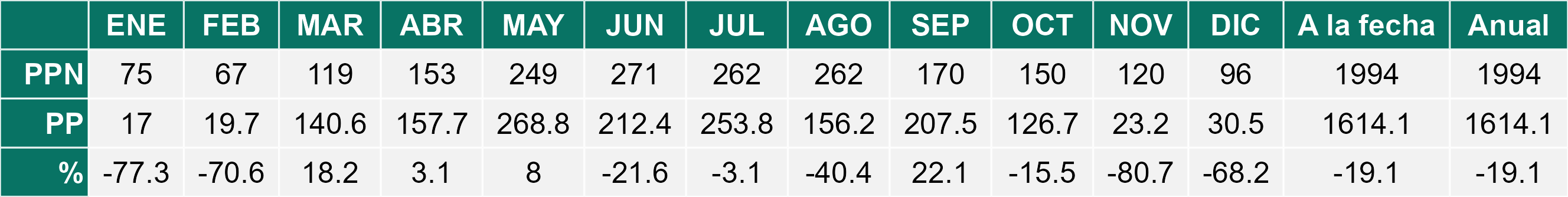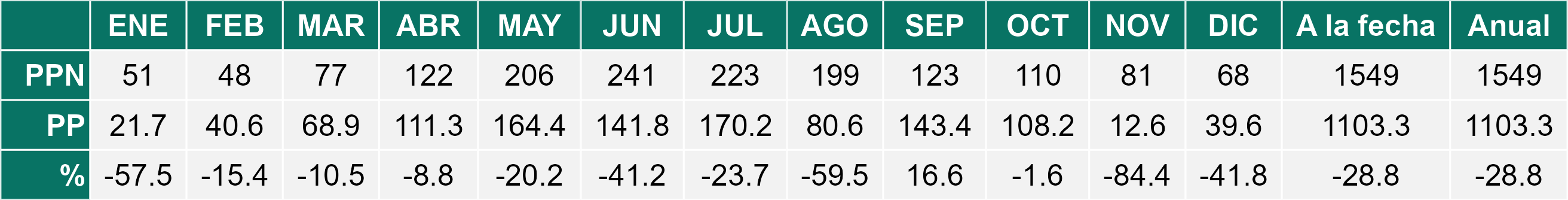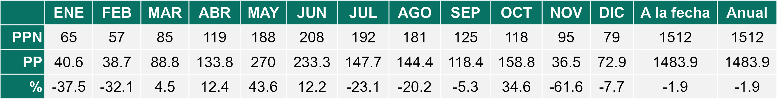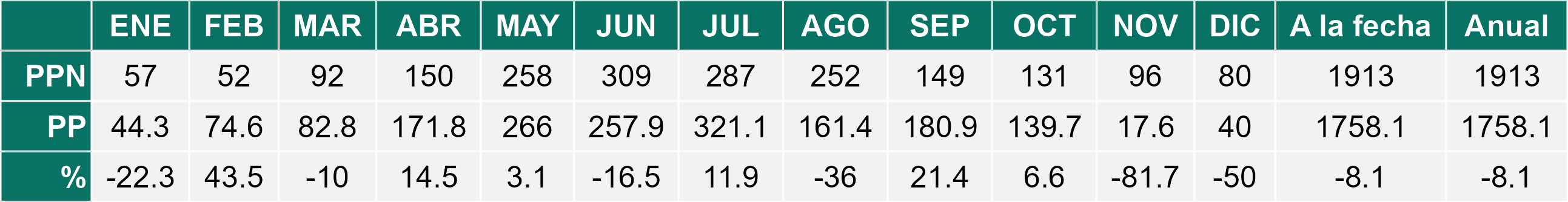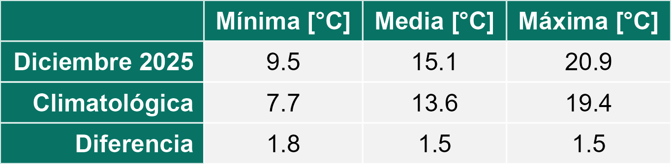 La estación La Pampa corresponde al distrito agroclimático 14-10-2. Para este distrito climático la temperatura mínima, media y máxima climatológicas alcanzan los 7.9°C, 14.2°C y 20.5°C respectivamente. Por su parte, respecto a las temperaturas medidas durante el mes de diciembre en la estación: la temperatura mínima alcanzo los 9°C (1.1°C sobre la climatológica), la temperatura media 14.5°C (0.3°C sobre la climatológica) y la temperatura máxima llegó a los 20.2°C (-0.3°C bajo la climatológica). En el mes de diciembre se registró una pluviometría de 39.6 mm, lo cual representa un 58.2% con respecto al mismo mes de un año normal. De enero a diciembre se ha registrado un total acumulado de 1103.3 mm, en circunstancias que un año normal registraría a la fecha 1549 mm, lo que representa un déficit de 28.8%. A la misma fecha, durante el año 2024 la precipitación alcanzaba los 19.3 mm.