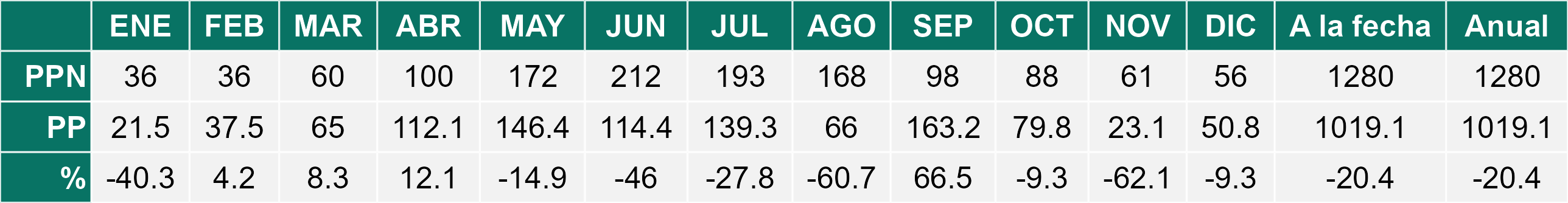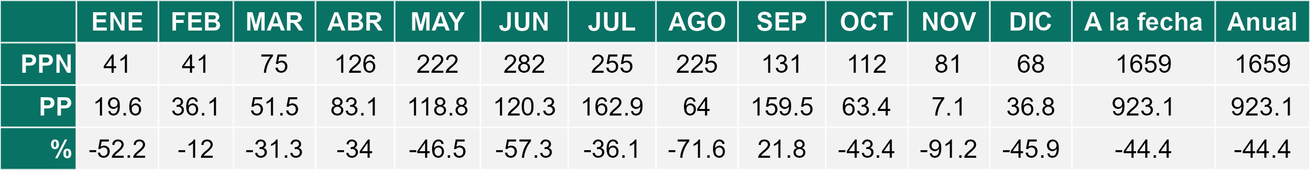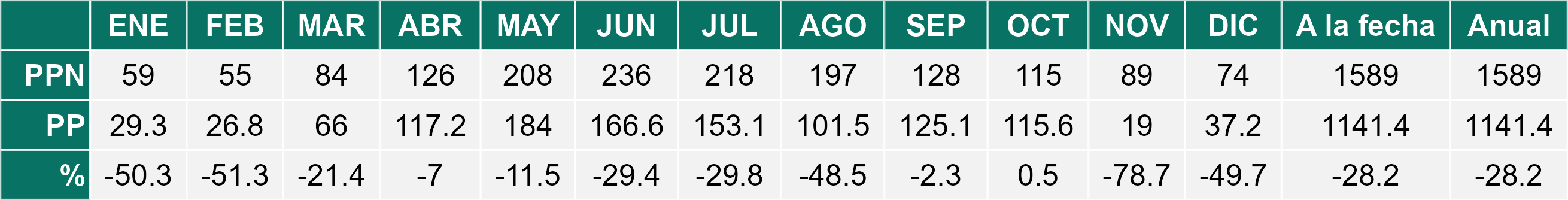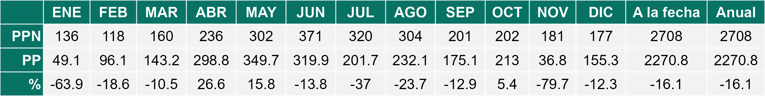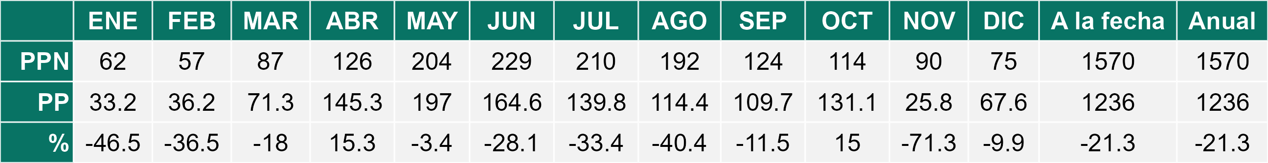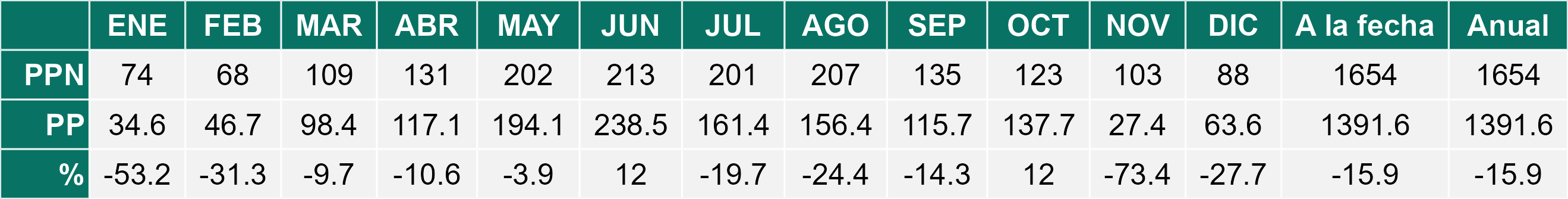 La estación La Pampa corresponde al distrito agroclimático 14-10-2. Para este distrito climático la temperatura mínima, media y máxima climatológicas alcanzan los 7.9°C, 14.2°C y 20.5°C respectivamente. Por su parte, respecto a las temperaturas medidas durante el mes de diciembre en la estación: la temperatura mínima alcanzo los 9°C (1.1°C sobre la climatológica), la temperatura media 14.5°C (0.3°C sobre la climatológica) y la temperatura máxima llegó a los 20.2°C (-0.3°C bajo la climatológica). En el mes de diciembre se registró una pluviometría de 39.6 mm, lo cual representa un 58.2% con respecto al mismo mes de un año normal. De enero a diciembre se ha registrado un total acumulado de 1103.3 mm, en circunstancias que un año normal registraría a la fecha 1549 mm, lo que representa un déficit de 28.8%. A la misma fecha, durante el año 2024 la precipitación alcanzaba los 19.3 mm.