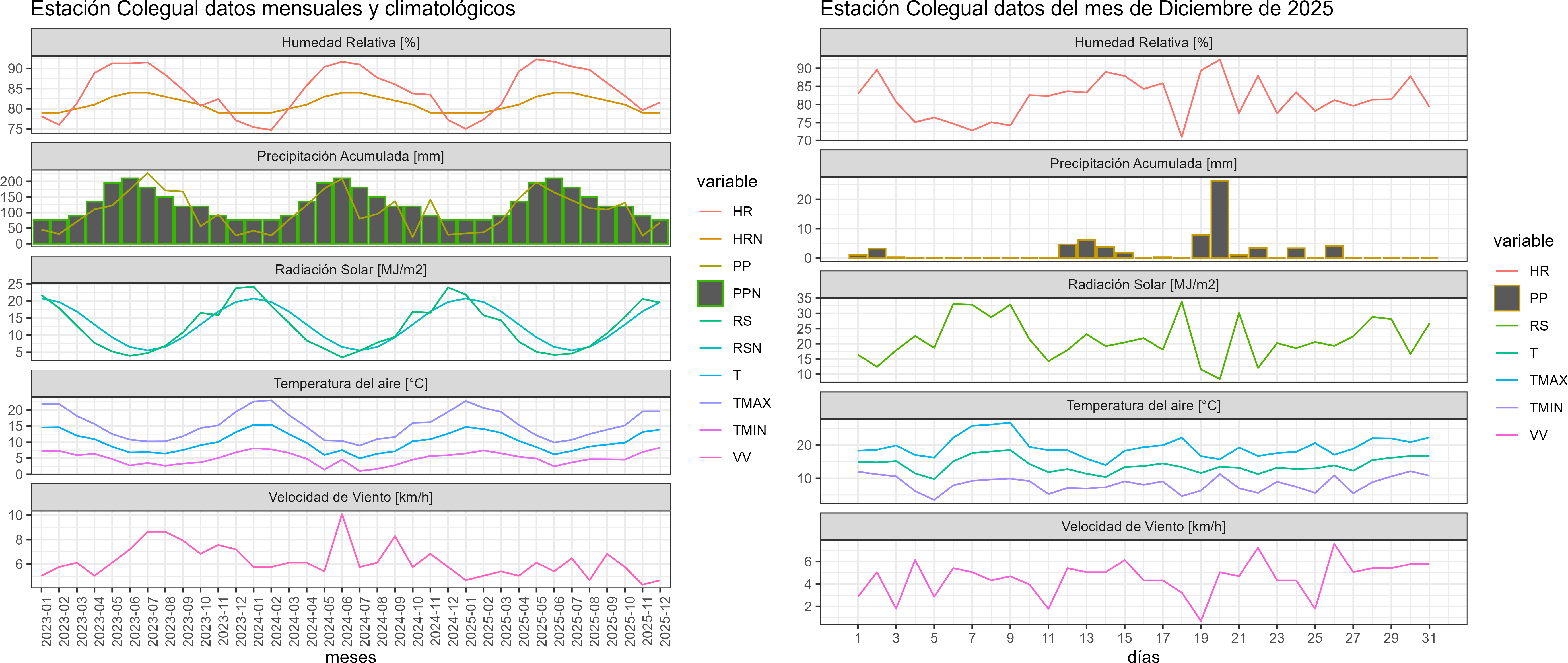 La estación Colegual corresponde al distrito agroclimático 14-10-1. Para este distrito climático la temperatura mínima, media y máxima climatológicas alcanzan los 7.7°C, 13.7°C y 19.7°C respectivamente. Por su parte, respecto a las temperaturas medidas durante el mes de diciembre en la estación: la temperatura mínima alcanzo los 8.3°C (0.6°C sobre la climatológica), la temperatura media 13.9°C (0.2°C sobre la climatológica) y la temperatura máxima llegó a los 19.5°C (-0.2°C bajo la climatológica). En el mes de diciembre se registró una pluviometría de 67.6 mm, lo cual representa un 90.1% con respecto al mismo mes de un año normal. De enero a diciembre se ha registrado un total acumulado de 1236 mm, en circunstancias que un año normal registraría a la fecha 1570 mm, lo que representa un déficit de 21.3%. A la misma fecha, durante el año 2024 la precipitación alcanzaba los 28.4 mm.