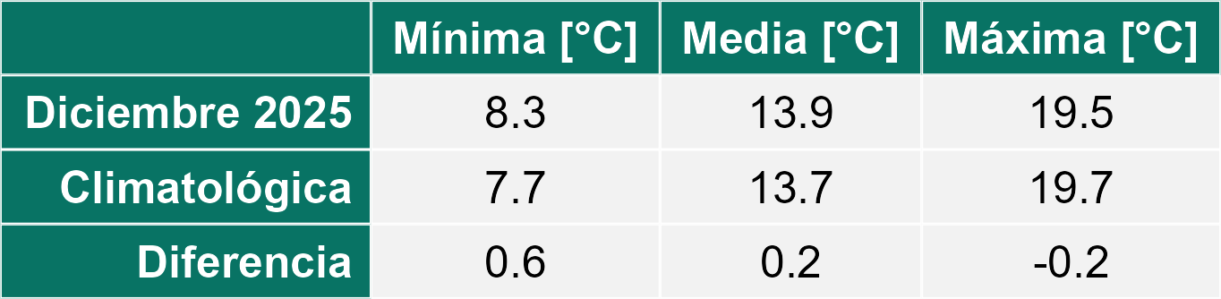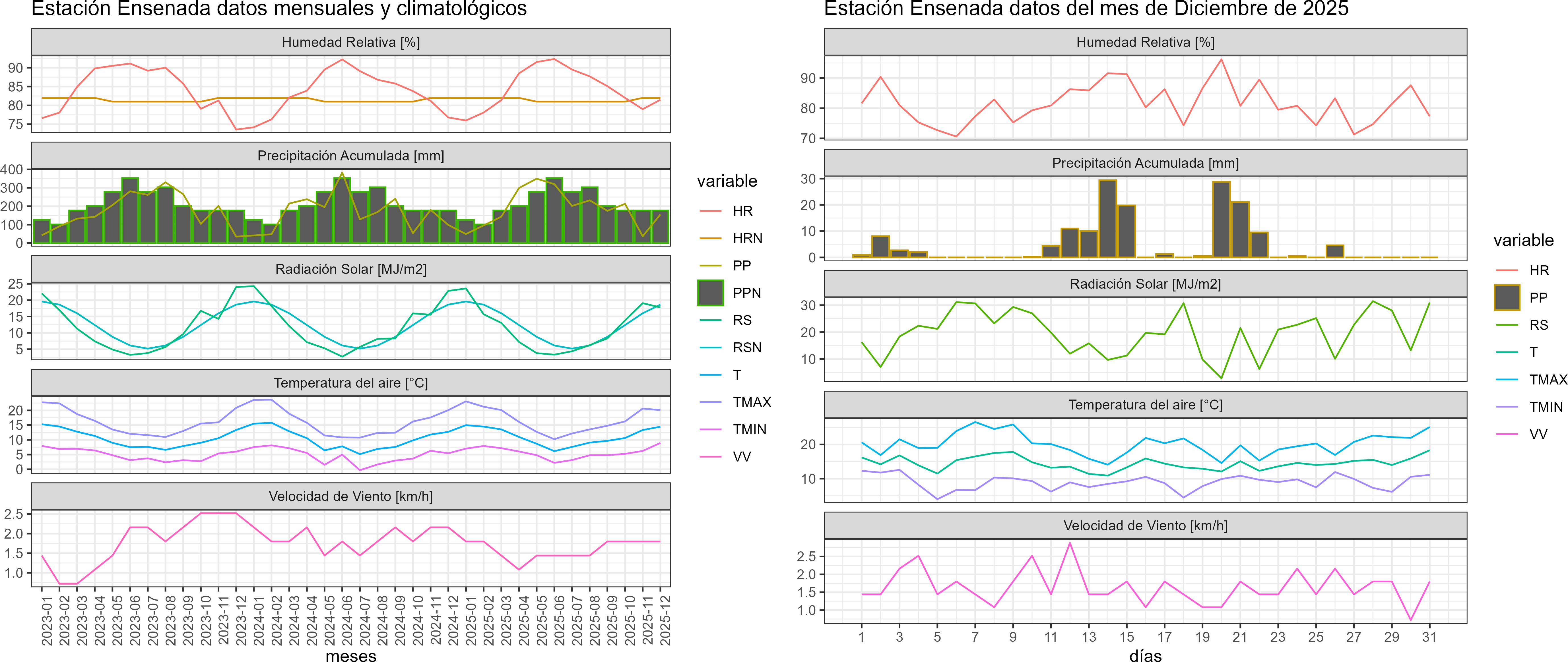 La estación Ensenada corresponde al distrito agroclimático 14-10-4. Para este distrito climático la temperatura mínima, media y máxima climatológicas alcanzan los 9°C, 13.9°C y 18.9°C respectivamente. Por su parte, respecto a las temperaturas medidas durante el mes de diciembre en la estación: la temperatura mínima alcanzo los 8.9°C (-0.1°C bajo la climatológica), la temperatura media 14.5°C (0.6°C sobre la climatológica) y la temperatura máxima llegó a los 20.1°C (1.2°C sobre la climatológica). En el mes de diciembre se registró una pluviometría de 155.3 mm, lo cual representa un 87.7% con respecto al mismo mes de un año normal. De enero a diciembre se ha registrado un total acumulado de 2270.8 mm, en circunstancias que un año normal registraría a la fecha 2708 mm, lo que representa un déficit de 16.1%. A la misma fecha, durante el año 2024 la precipitación alcanzaba los 98.4 mm.