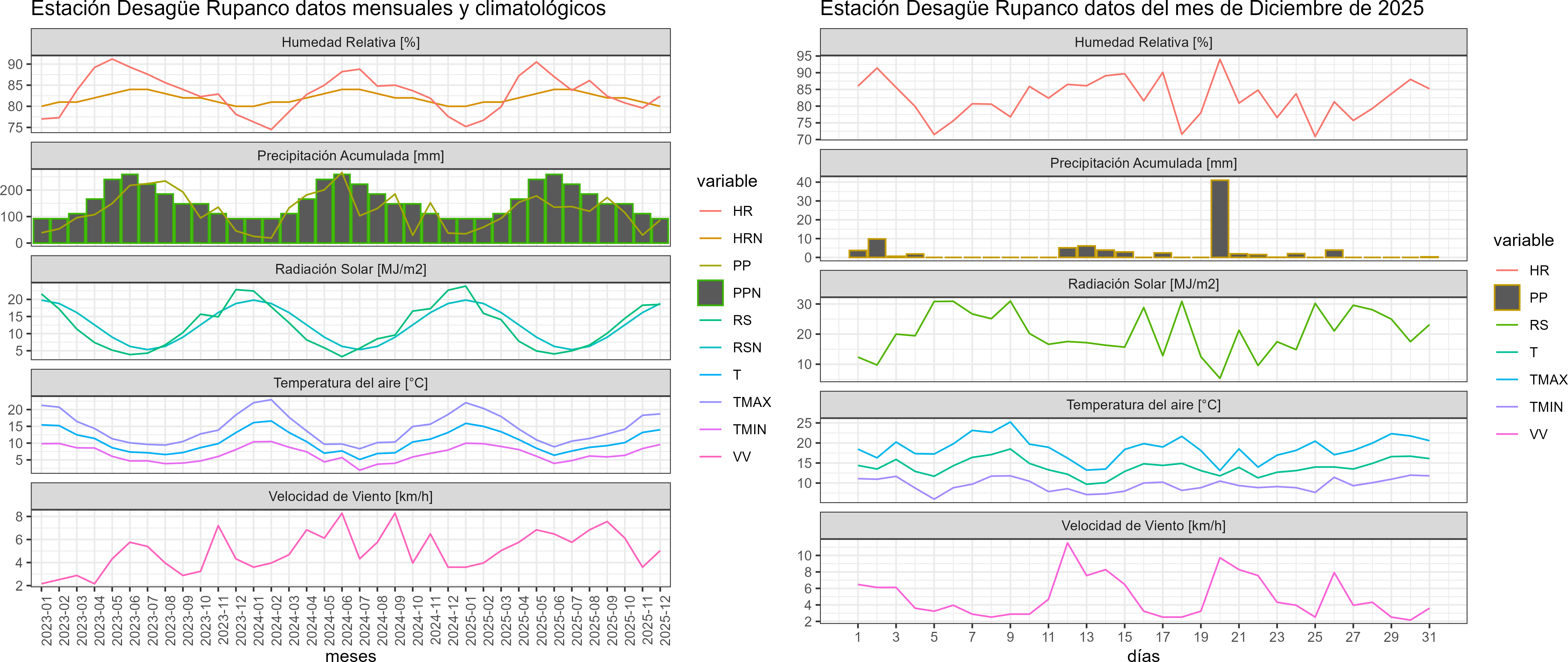 La estación Desagüe Rupanco corresponde al distrito agroclimático 14-10-3. Para este distrito climático la temperatura mínima, media y máxima climatológicas alcanzan los 8.8°C, 14.1°C y 19.4°C respectivamente. Por su parte, respecto a las temperaturas medidas durante el mes de diciembre en la estación: la temperatura mínima alcanzo los 9.6°C (0.8°C sobre la climatológica), la temperatura media 14°C (-0.1°C bajo la climatológica) y la temperatura máxima llegó a los 18.7°C (-0.7°C bajo la climatológica). En el mes de diciembre se registró una pluviometría de 87 mm, lo cual representa un 82.1% con respecto al mismo mes de un año normal. De enero a diciembre se ha registrado un total acumulado de 1317.2 mm, en circunstancias que un año normal registraría a la fecha 1939 mm, lo que representa un déficit de 32.1%. A la misma fecha, durante el año 2024 la precipitación alcanzaba los 37.8 mm.