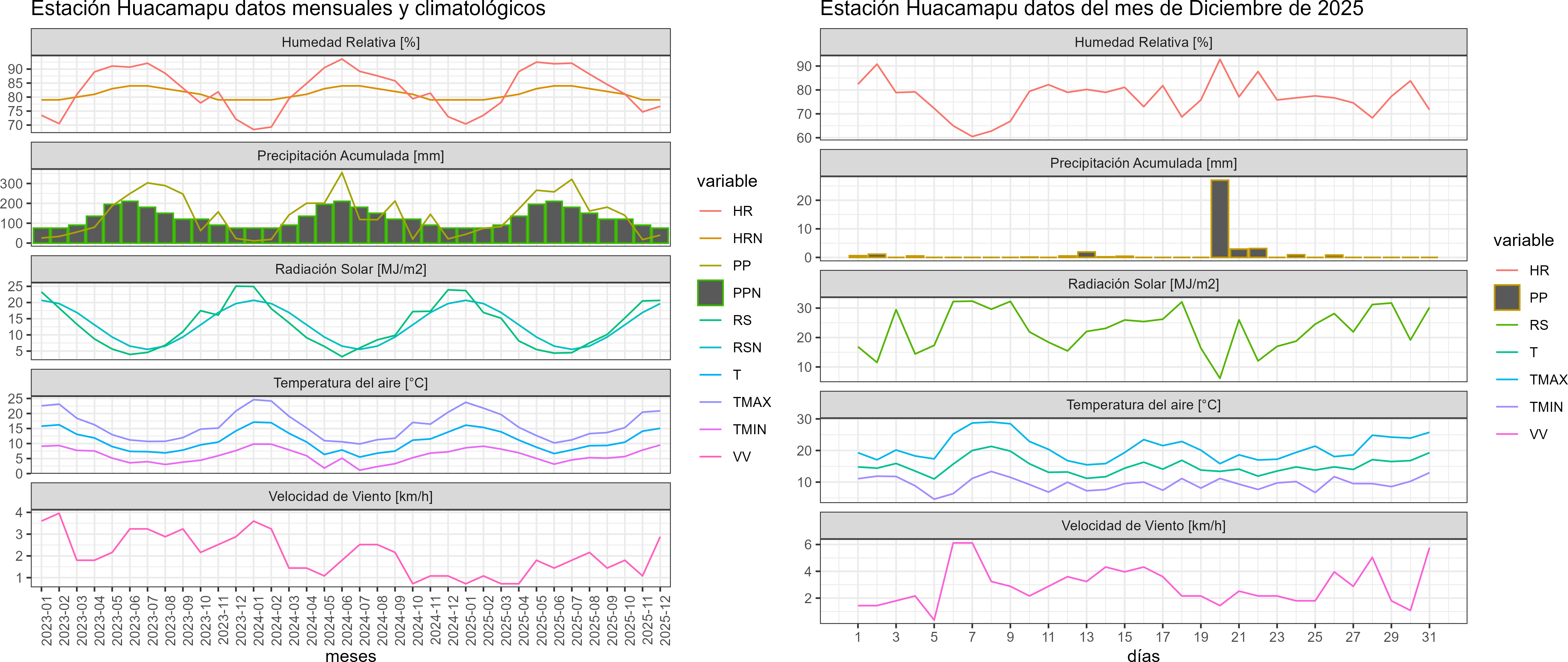 La estación Huacamapu corresponde al distrito agroclimático 14-10-1. Para este distrito climático la temperatura mínima, media y máxima climatológicas alcanzan los 7.7°C, 13.6°C y 19.4°C respectivamente. Por su parte, respecto a las temperaturas medidas durante el mes de diciembre en la estación: la temperatura mínima alcanzo los 9.5°C (1.8°C sobre la climatológica), la temperatura media 15.1°C (1.5°C sobre la climatológica) y la temperatura máxima llegó a los 20.9°C (1.5°C sobre la climatológica). En el mes de diciembre se registró una pluviometría de 40 mm, lo cual representa un 50% con respecto al mismo mes de un año normal. De enero a diciembre se ha registrado un total acumulado de 1758.1 mm, en circunstancias que un año normal registraría a la fecha 1913 mm, lo que representa un déficit de 8.1%. A la misma fecha, durante el año 2024 la precipitación alcanzaba los 21.2 mm.