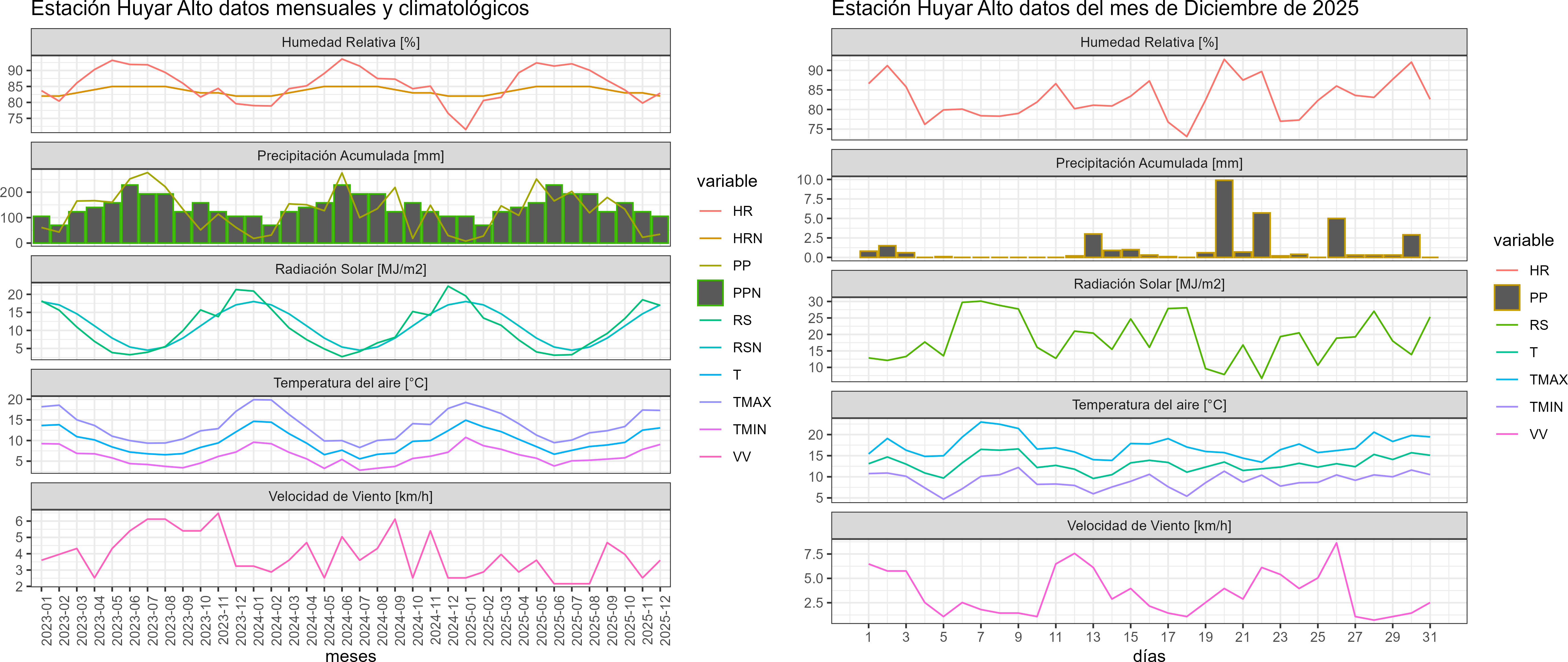 La estación Huyar Alto corresponde al distrito agroclimático 10-4. Para este distrito climático la temperatura mínima, media y máxima climatológicas alcanzan los 8.7°C, 13.2°C y 17.6°C respectivamente. Por su parte, respecto a las temperaturas medidas durante el mes de diciembre en la estación: la temperatura mínima alcanzo los 9.1°C (0.4°C sobre la climatológica), la temperatura media 13.1°C (-0.1°C bajo la climatológica) y la temperatura máxima llegó a los 17.3°C (-0.3°C bajo la climatológica). En el mes de diciembre se registró una pluviometría de 34.8 mm, lo cual representa un 41.9% con respecto al mismo mes de un año normal. De enero a diciembre se ha registrado un total acumulado de 1399 mm, en circunstancias que un año normal registraría a la fecha 1711 mm, lo que representa un déficit de 18.2%. A la misma fecha, durante el año 2024 la precipitación alcanzaba los 29.7 mm.