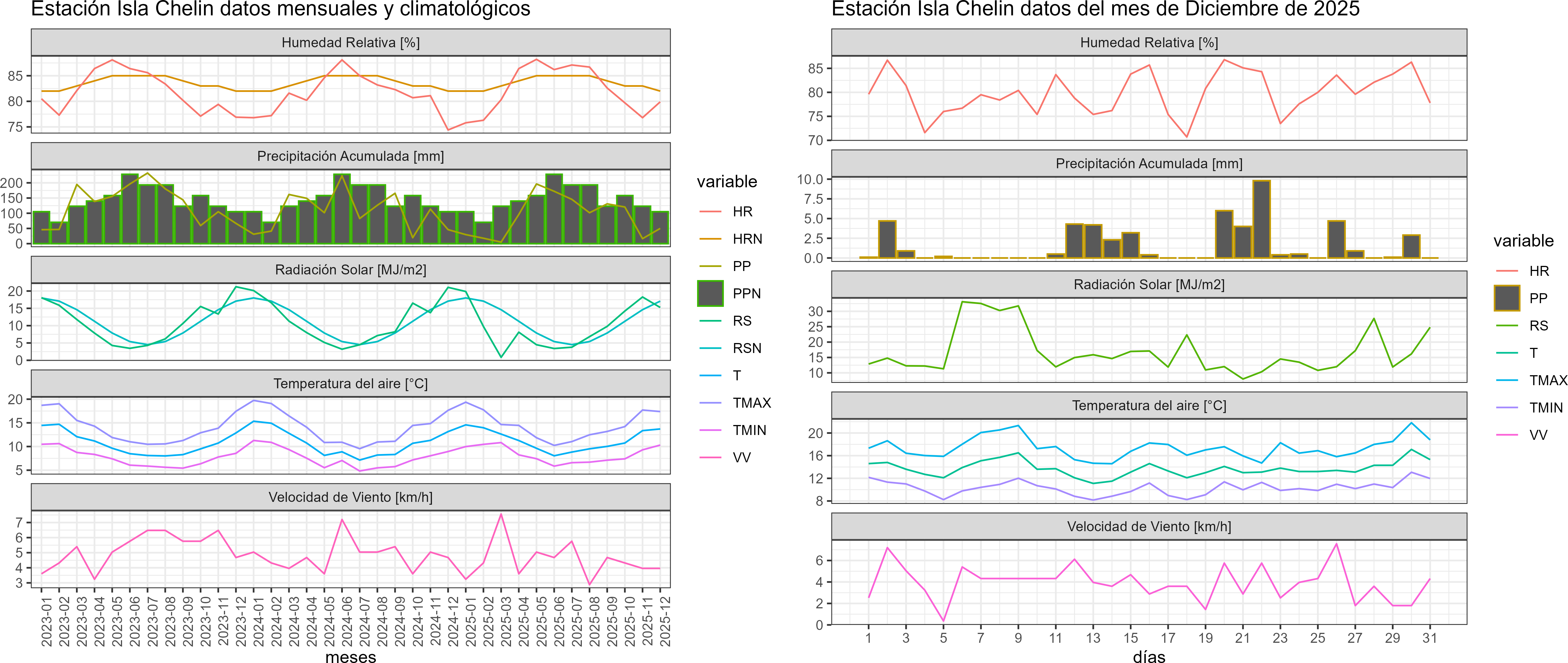 La estación Isla Chelin corresponde al distrito agroclimático 10-4. Para este distrito climático la temperatura mínima, media y máxima climatológicas alcanzan los 9.2°C, 13.2°C y 17.2°C respectivamente. Por su parte, respecto a las temperaturas medidas durante el mes de diciembre en la estación: la temperatura mínima alcanzo los 10.3°C (1.1°C sobre la climatológica), la temperatura media 13.7°C (0.5°C sobre la climatológica) y la temperatura máxima llegó a los 17.4°C (0.2°C sobre la climatológica). En el mes de diciembre se registró una pluviometría de 50.1 mm, lo cual representa un 61.9% con respecto al mismo mes de un año normal. De enero a diciembre se ha registrado un total acumulado de 1082.1 mm, en circunstancias que un año normal registraría a la fecha 1590 mm, lo que representa un déficit de 31.9%. A la misma fecha, durante el año 2024 la precipitación alcanzaba los 46.1 mm.