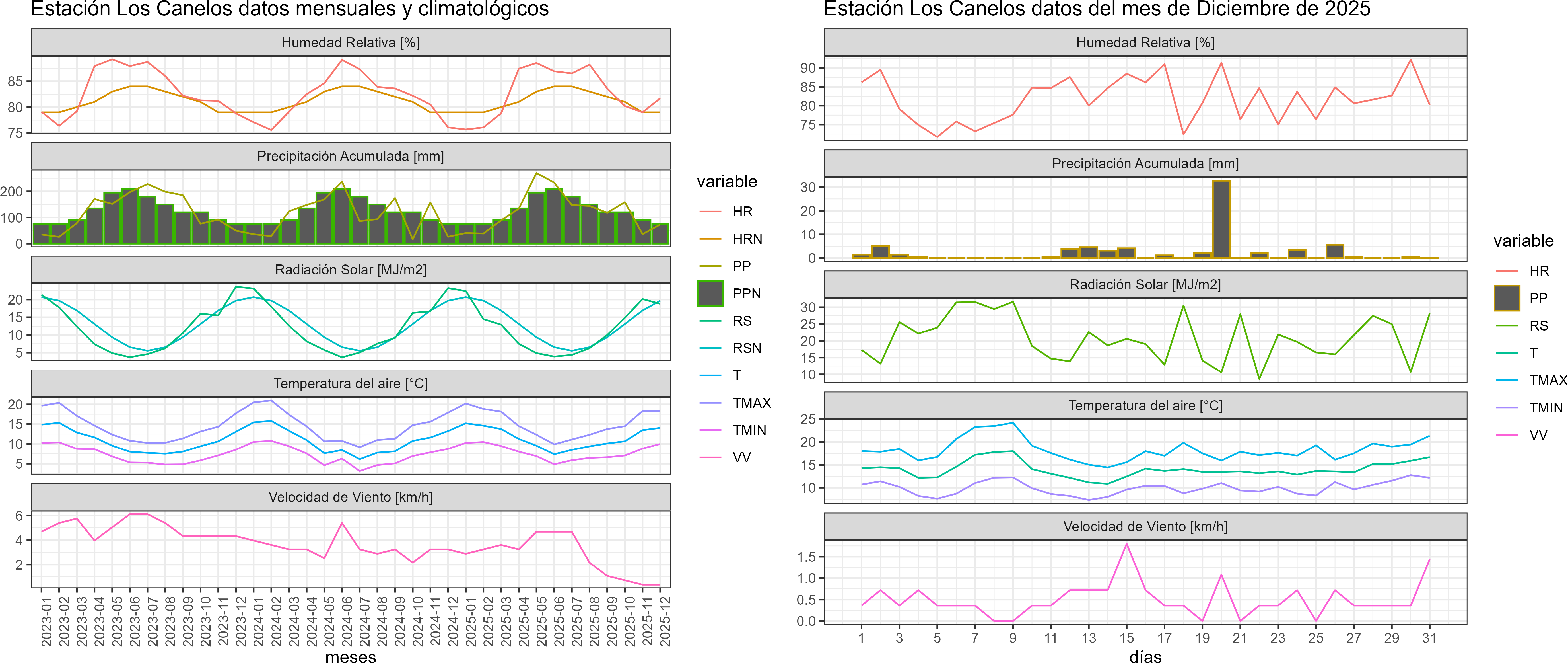 La estación Los Canelos corresponde al distrito agroclimático 14-10-1. Para este distrito climático la temperatura mínima, media y máxima climatológicas alcanzan los 8°C, 13.8°C y 19.7°C respectivamente. Por su parte, respecto a las temperaturas medidas durante el mes de diciembre en la estación: la temperatura mínima alcanzo los 10°C (2°C sobre la climatológica), la temperatura media 14°C (0.2°C sobre la climatológica) y la temperatura máxima llegó a los 18.3°C (-1.4°C bajo la climatológica). En el mes de diciembre se registró una pluviometría de 72.9 mm, lo cual representa un 92.3% con respecto al mismo mes de un año normal. De enero a diciembre se ha registrado un total acumulado de 1483.9 mm, en circunstancias que un año normal registraría a la fecha 1512 mm, lo que representa un déficit de 1.9%. A la misma fecha, durante el año 2024 la precipitación alcanzaba los 26.3 mm.