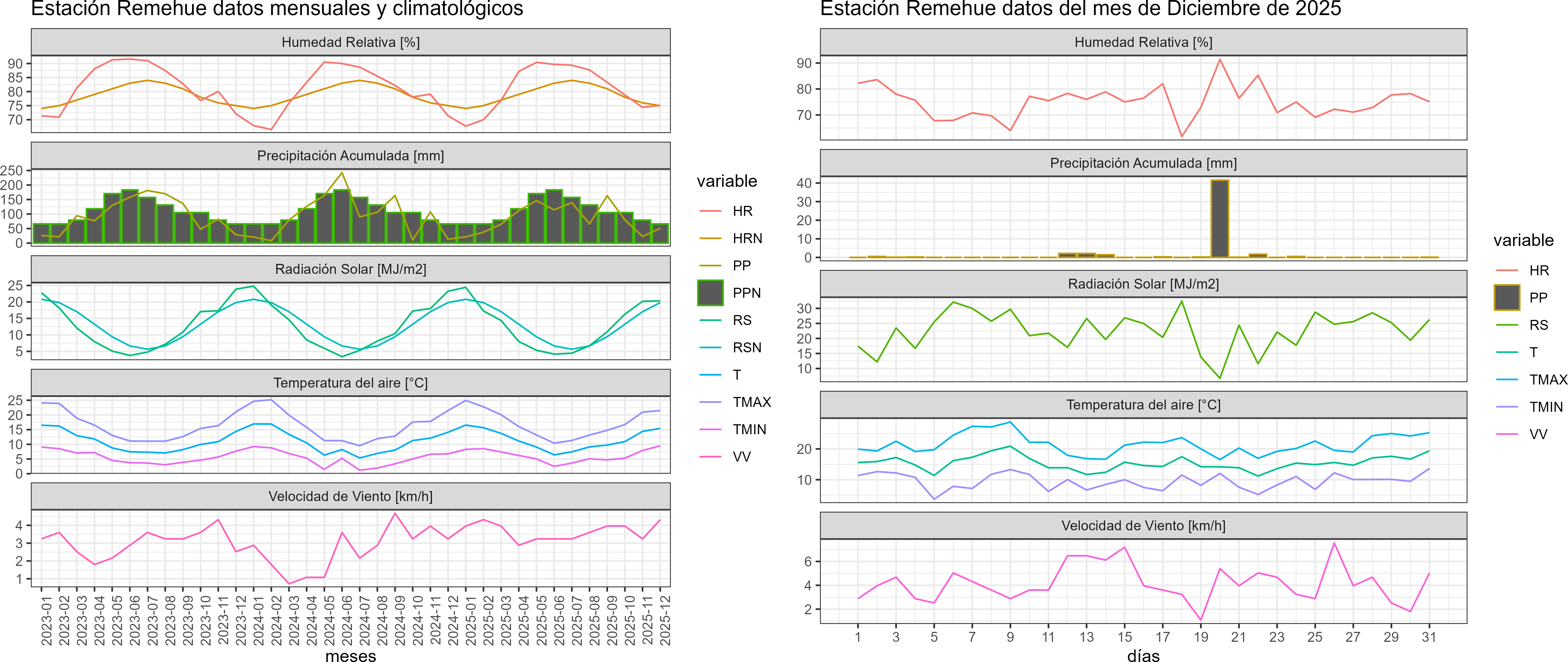 La estación Remehue corresponde al distrito agroclimático 14-10-2. Para este distrito climático la temperatura mínima, media y máxima climatológicas alcanzan los 8.1°C, 14.9°C y 21.7°C respectivamente. Por su parte, respecto a las temperaturas medidas durante el mes de diciembre en la estación: la temperatura mínima alcanzo los 9.5°C (1.4°C sobre la climatológica), la temperatura media 15.4°C (0.5°C sobre la climatológica) y la temperatura máxima llegó a los 21.5°C (-0.2°C bajo la climatológica). En el mes de diciembre se registró una pluviometría de 50.8 mm, lo cual representa un 90.7% con respecto al mismo mes de un año normal. De enero a diciembre se ha registrado un total acumulado de 1019.1 mm, en circunstancias que un año normal registraría a la fecha 1280 mm, lo que representa un déficit de 20.4%. A la misma fecha, durante el año 2024 la precipitación alcanzaba los 13.4 mm.