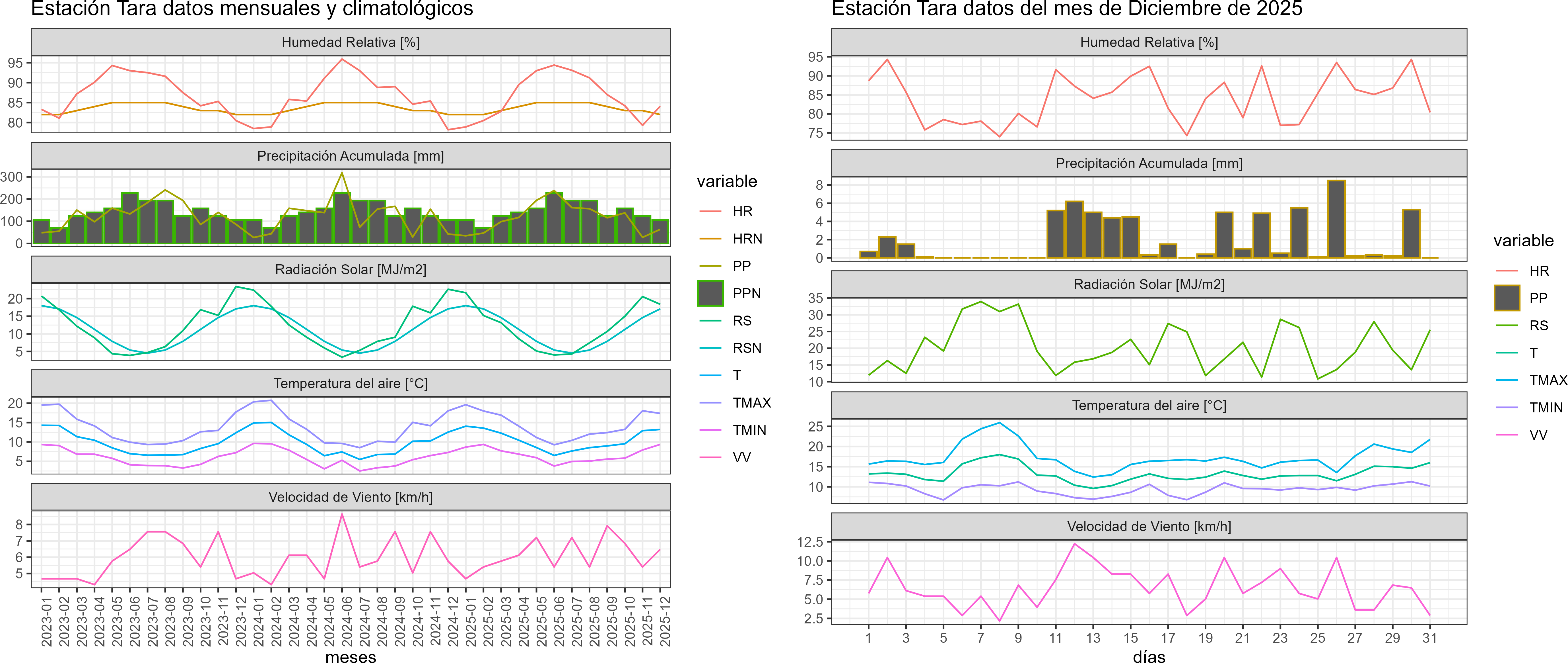 La estación Tara corresponde al distrito agroclimático 10-4. Para este distrito climático la temperatura mínima, media y máxima climatológicas alcanzan los 7.8°C, 12.8°C y 17.8°C respectivamente. Por su parte, respecto a las temperaturas medidas durante el mes de diciembre en la estación: la temperatura mínima alcanzo los 9.4°C (1.6°C sobre la climatológica), la temperatura media 13.2°C (0.4°C sobre la climatológica) y la temperatura máxima llegó a los 17.4°C (-0.4°C bajo la climatológica). En el mes de diciembre se registró una pluviometría de 63.6 mm, lo cual representa un 72.3% con respecto al mismo mes de un año normal. De enero a diciembre se ha registrado un total acumulado de 1391.6 mm, en circunstancias que un año normal registraría a la fecha 1654 mm, lo que representa un déficit de 15.9%. A la misma fecha, durante el año 2024 la precipitación alcanzaba los 42.4 mm.