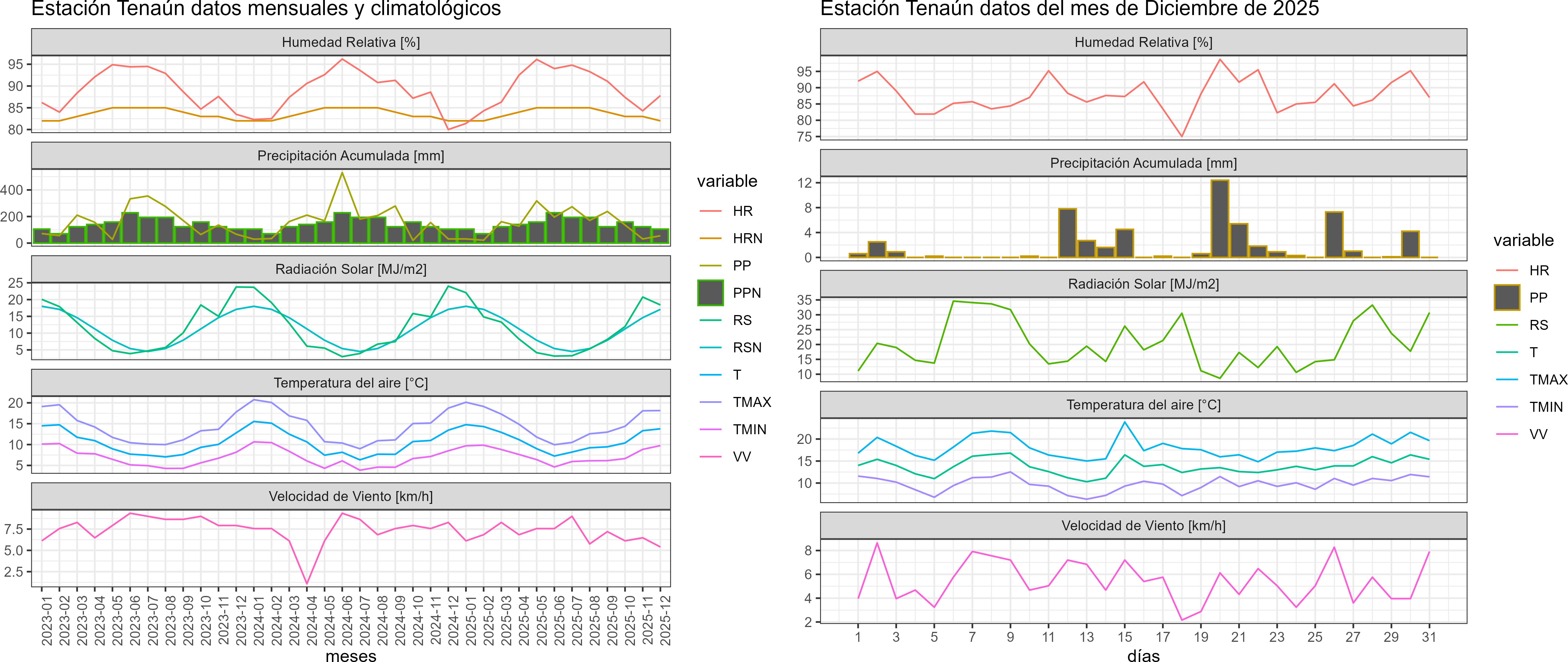 La estación Tenaún corresponde al distrito agroclimático 10-4. Para este distrito climático la temperatura mínima, media y máxima climatológicas alcanzan los 9.5°C, 13°C y 16.5°C respectivamente. Por su parte, respecto a las temperaturas medidas durante el mes de diciembre en la estación: la temperatura mínima alcanzo los 9.8°C (0.3°C sobre la climatológica), la temperatura media 13.8°C (0.8°C sobre la climatológica) y la temperatura máxima llegó a los 18.1°C (1.6°C sobre la climatológica). En el mes de diciembre se registró una pluviometría de 55.2 mm, lo cual representa un 58.7% con respecto al mismo mes de un año normal. De enero a diciembre se ha registrado un total acumulado de 1759.1 mm, en circunstancias que un año normal registraría a la fecha 1884 mm, lo que representa un déficit de 6.6%. A la misma fecha, durante el año 2024 la precipitación alcanzaba los 31.2 mm.