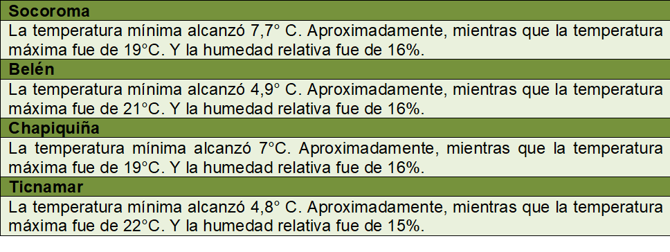 La extensión de bajas temperaturas registradas en la zona de la Precordillera de la comuna de Putre, han generado el aplazamiento para el mes de septiembre de la preparación de suelo para el próximo establecimiento del cultivo de maíz, sin embargo, se ha elaborado un cuadro con información climática: