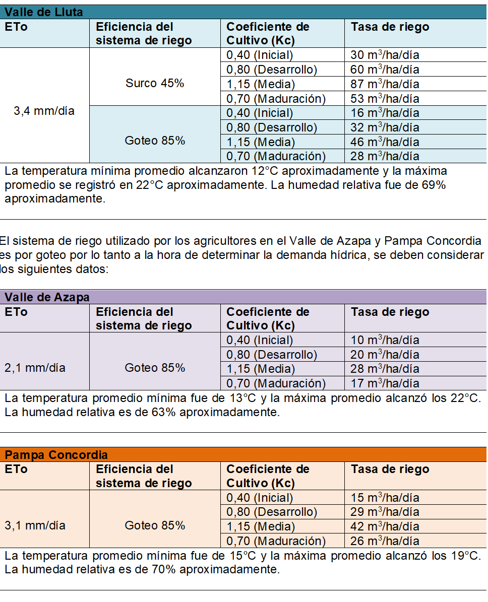 En el Valle de Lluta, los agricultores aún realizan el riego tradicional que es por surco, sin embargo, se ha ido incorporado el sistema de riego por goteo, con el objetivo de determinar la demanda hídrica del cultivo se ha elaborado el siguiente cuadro: