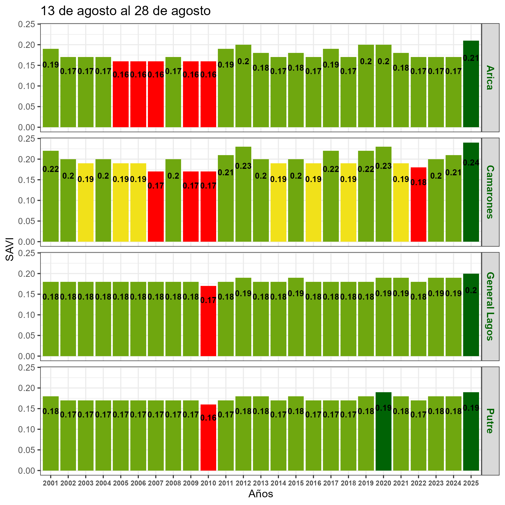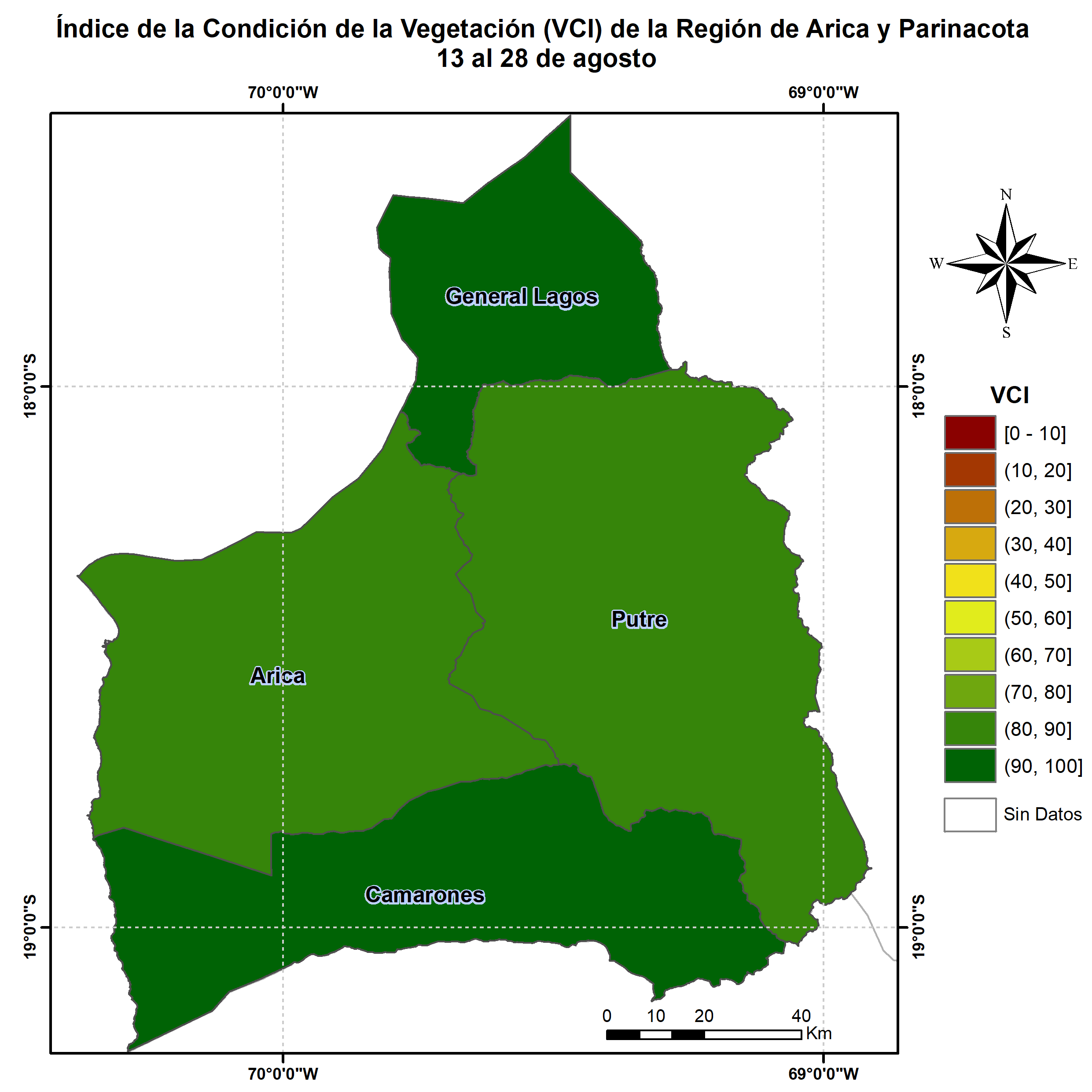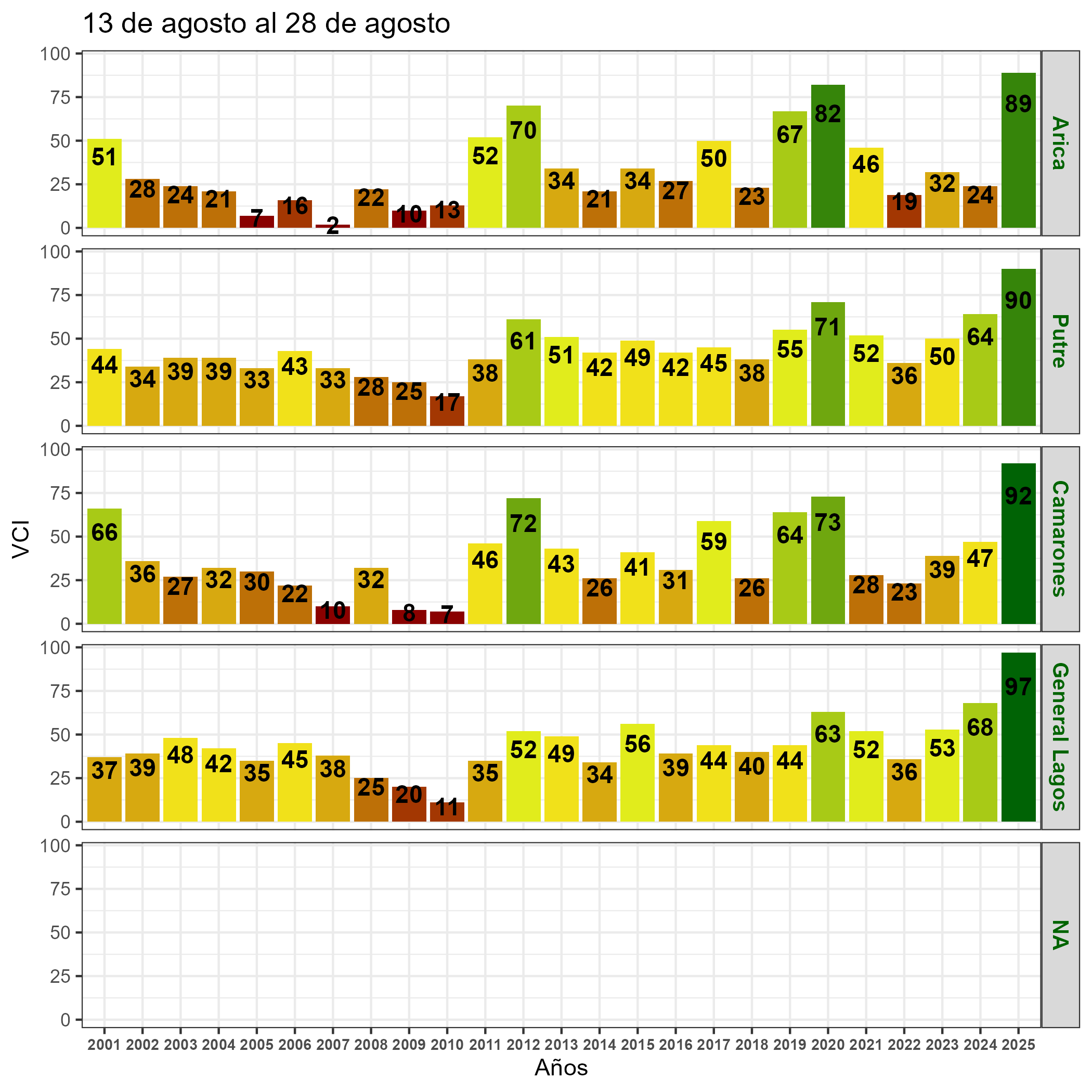 En términos globales la Región presentó un valor mediano de VCI de 92% para el período comprendido desde el 13 al 28 de agosto. A igual período del año pasado presentaba un VCI de 57% (Fig. 1). De acuerdo a la Tabla 1 la Región de Arica y Parinacota, en términos globales presenta una condición Favorable.