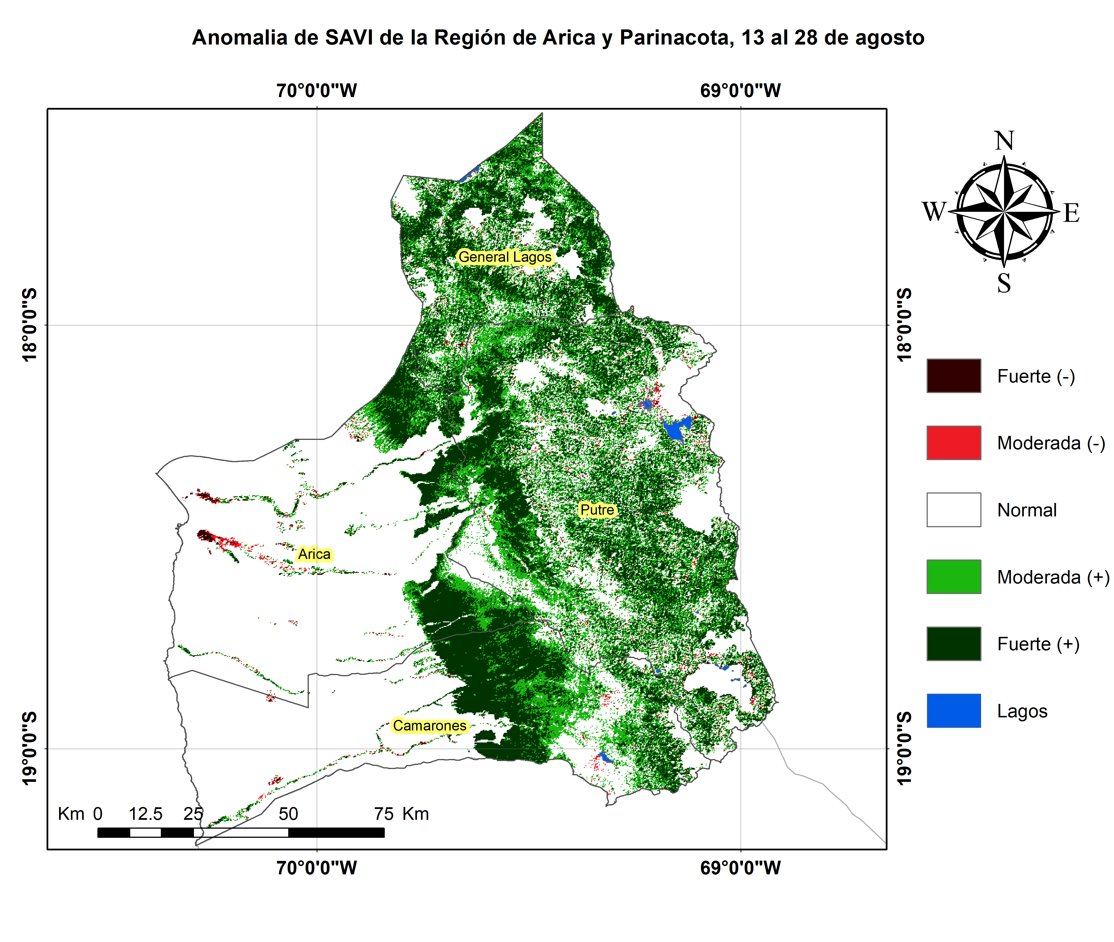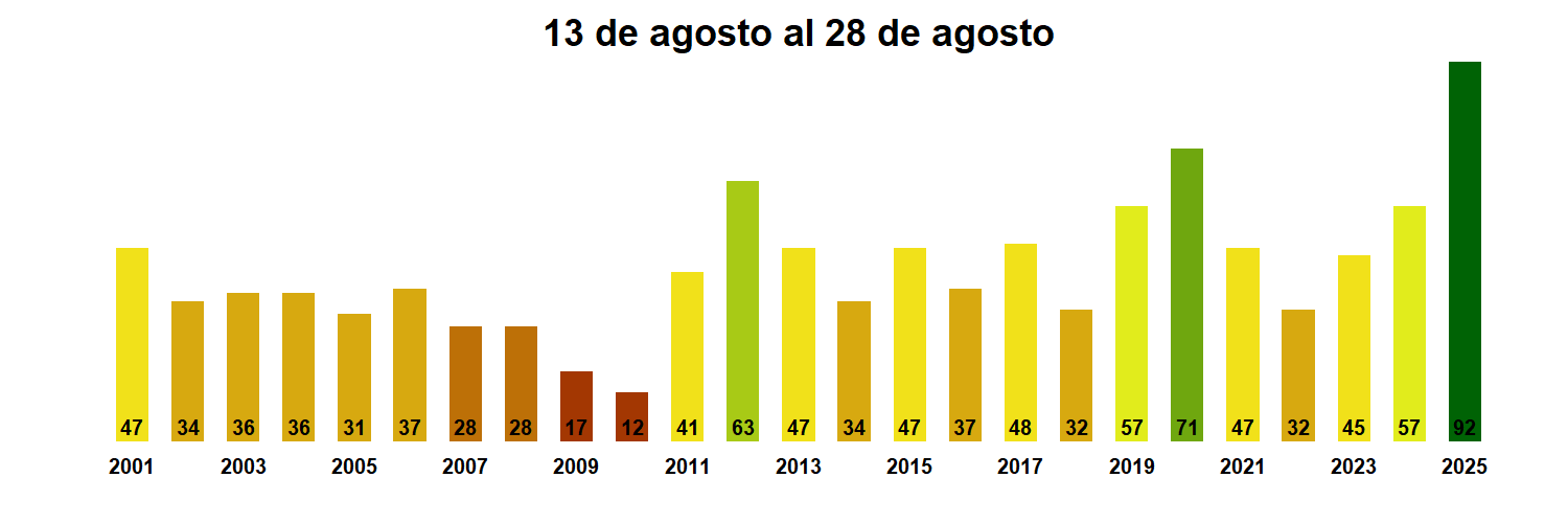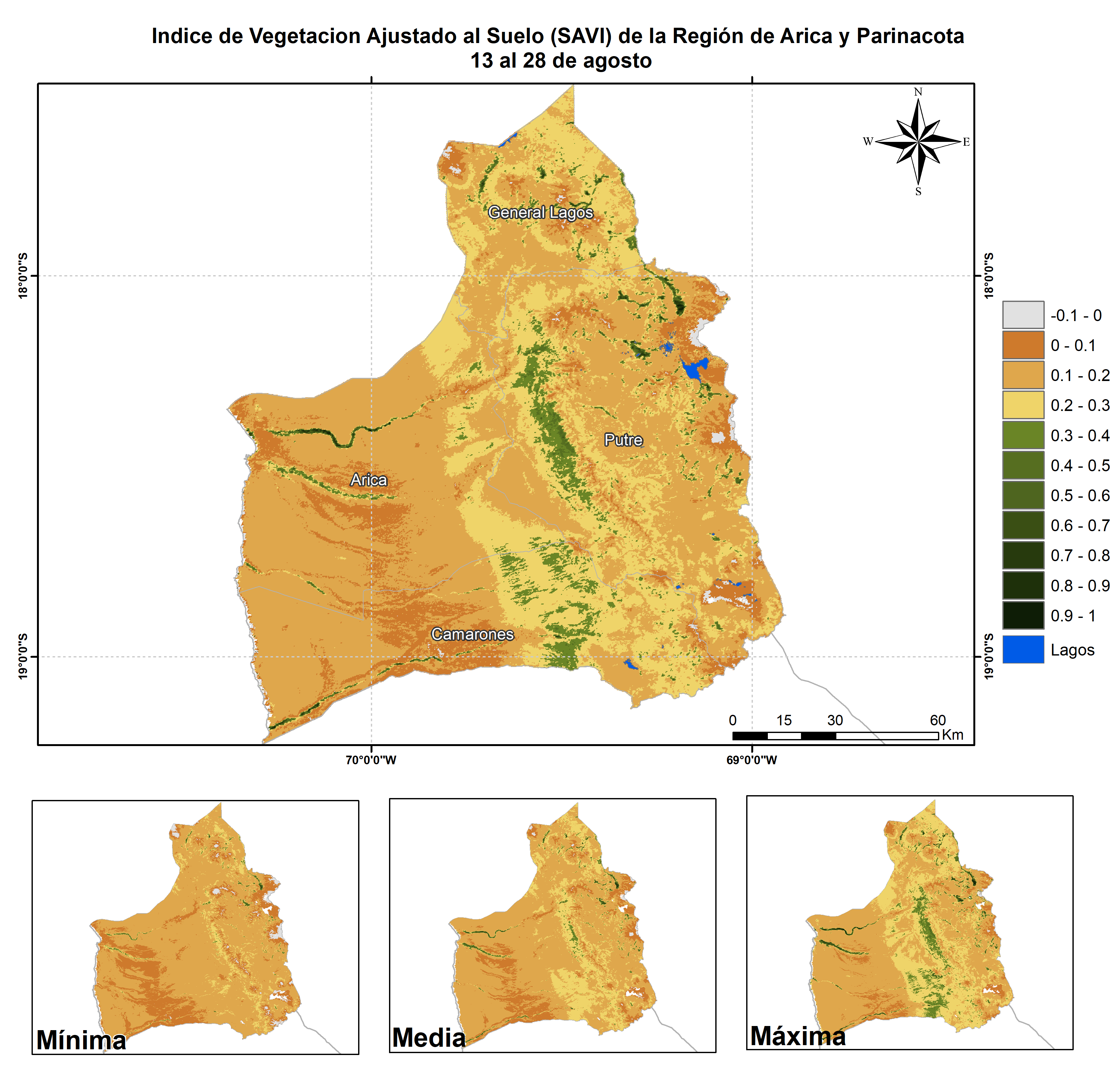 En términos globales la Región presentó un valor mediano de VCI de 92% para el período comprendido desde el 13 al 28 de agosto. A igual período del año pasado presentaba un VCI de 57% (Fig. 1). De acuerdo a la Tabla 1 la Región de Arica y Parinacota, en términos globales presenta una condición Favorable.