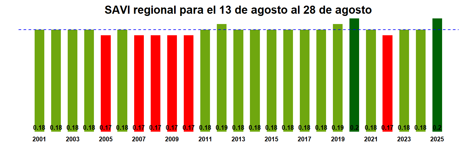 Para esta quincena se observa un SAVI promedio regional de 0.2 mientras el año pasado había sido de 0.18. El valor promedio histórico para esta región, en este período del año es de 0.18.