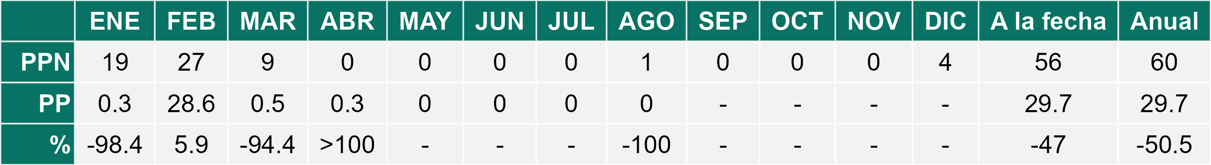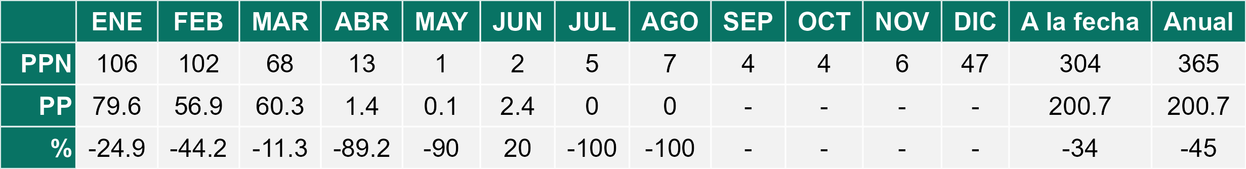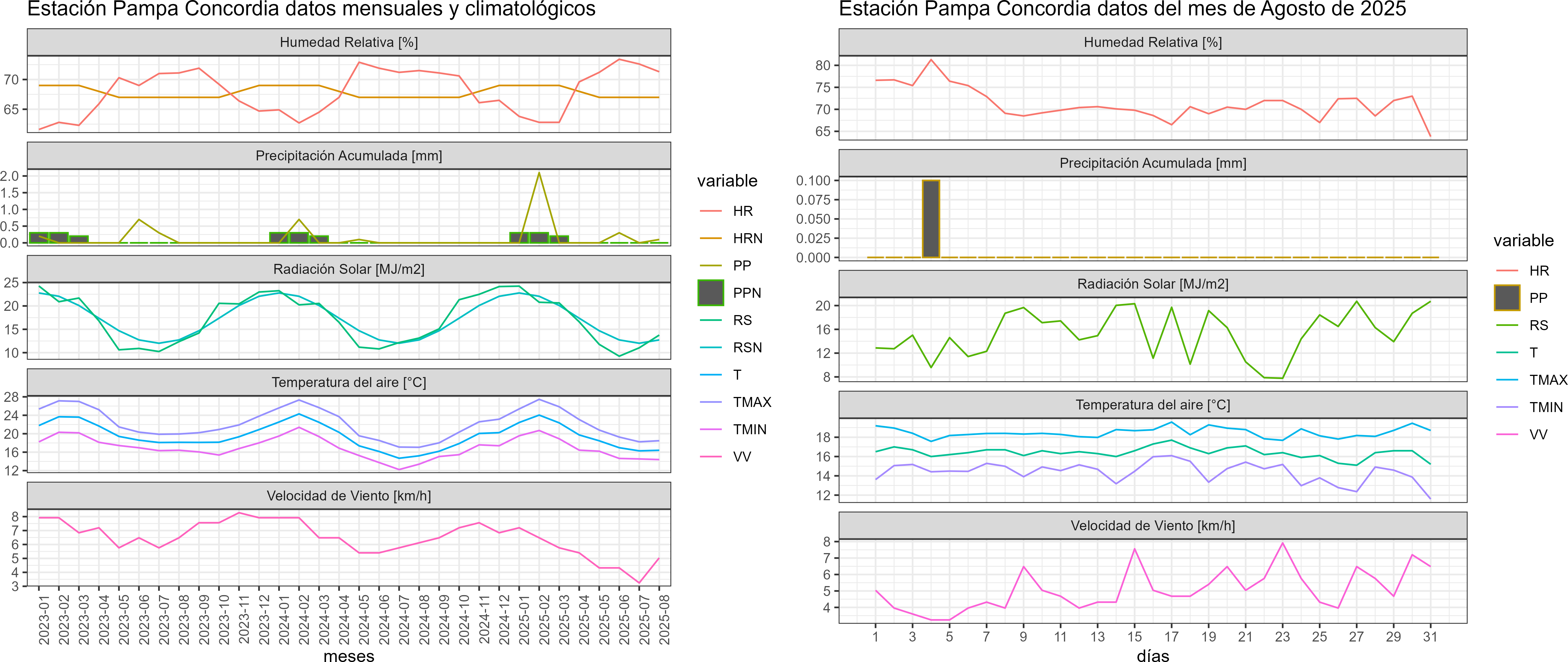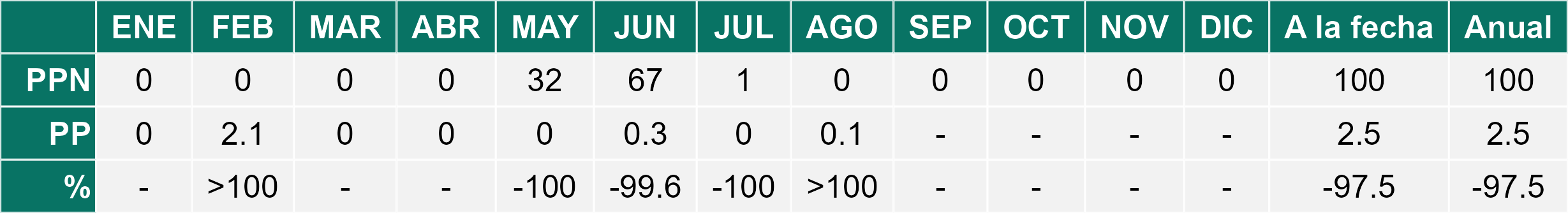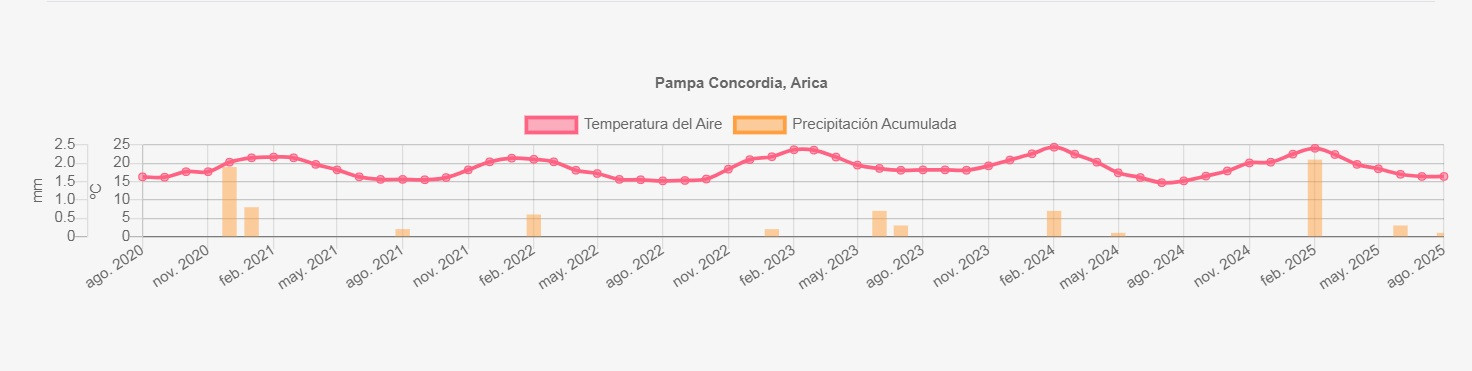 La estación Pampa Concordia corresponde al distrito agroclimático 15-1. Para este distrito climático la temperatura mínima, media y máxima climatológicas alcanzan los 13.1°C, 15.5°C y 17.9°C respectivamente. Por su parte, respecto a las temperaturas medidas durante el mes de agosto en la estación: la temperatura mínima alcanzo los 14.4°C (1.3°C sobre la climatológica), la temperatura media 16.4°C (0.9°C sobre la climatológica) y la temperatura máxima llegó a los 18.5°C (0.6°C sobre la climatológica). En el mes de agosto se registró una pluviometría de 0.1 mm, lo cual representa un superávit de más de un 100% De enero a agosto se ha registrado un total acumulado de 2.5 mm, en circunstancias que un año normal registraría a la fecha 100 mm, lo que representa un déficit de 97.5%. A la misma fecha, durante el año 2024 la precipitación alcanzaba los 0 mm.