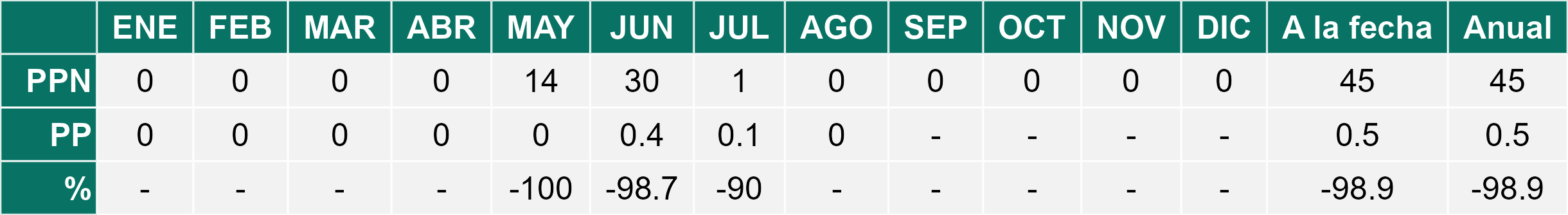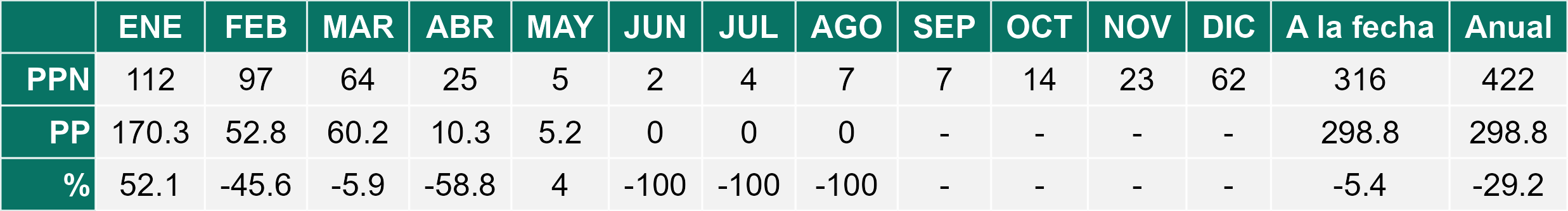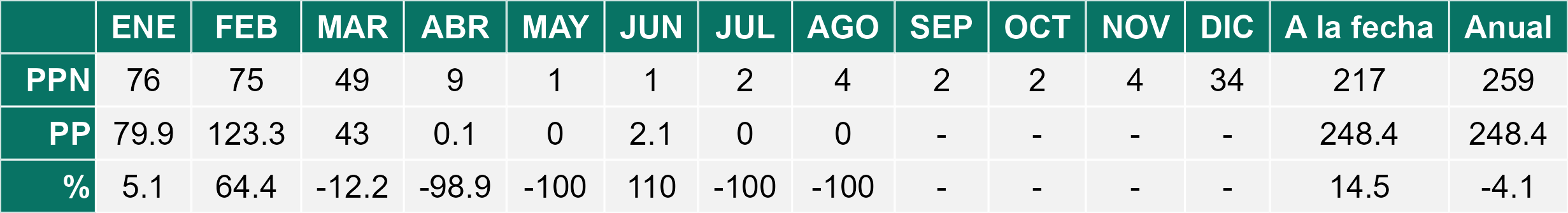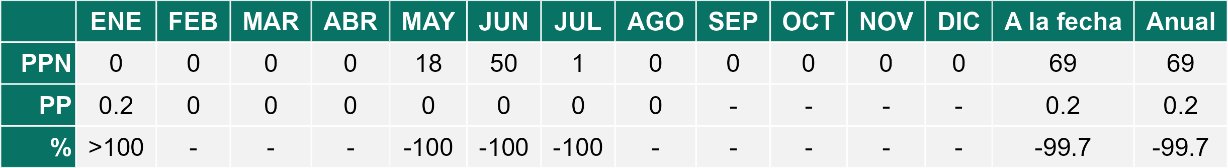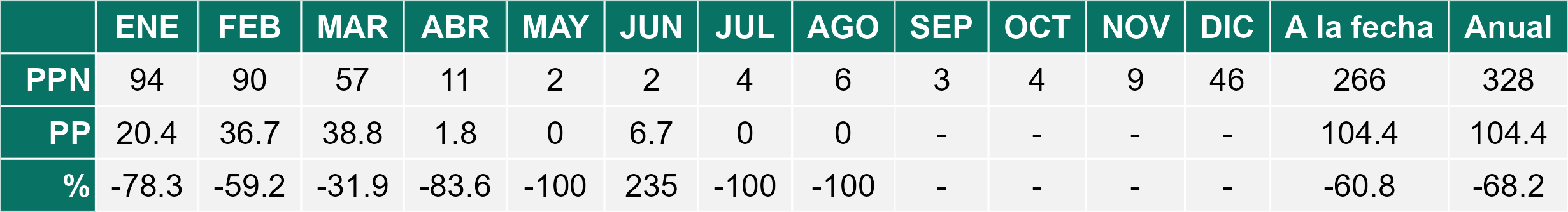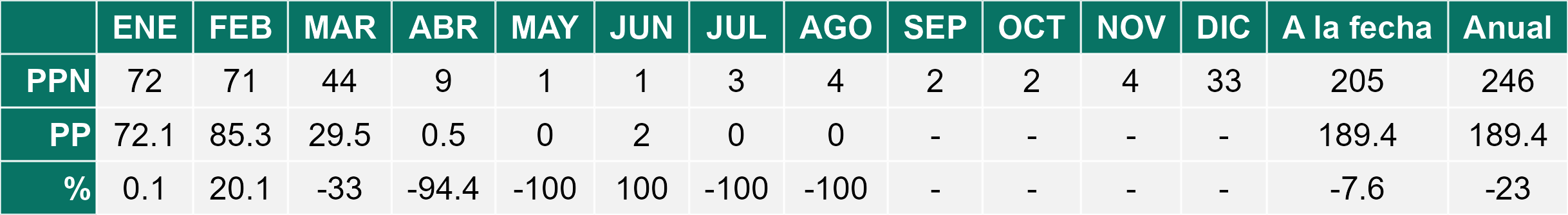 La estación Pampa Concordia corresponde al distrito agroclimático 15-1. Para este distrito climático la temperatura mínima, media y máxima climatológicas alcanzan los 13.1°C, 15.5°C y 17.9°C respectivamente. Por su parte, respecto a las temperaturas medidas durante el mes de agosto en la estación: la temperatura mínima alcanzo los 14.4°C (1.3°C sobre la climatológica), la temperatura media 16.4°C (0.9°C sobre la climatológica) y la temperatura máxima llegó a los 18.5°C (0.6°C sobre la climatológica). En el mes de agosto se registró una pluviometría de 0.1 mm, lo cual representa un superávit de más de un 100% De enero a agosto se ha registrado un total acumulado de 2.5 mm, en circunstancias que un año normal registraría a la fecha 100 mm, lo que representa un déficit de 97.5%. A la misma fecha, durante el año 2024 la precipitación alcanzaba los 0 mm.
