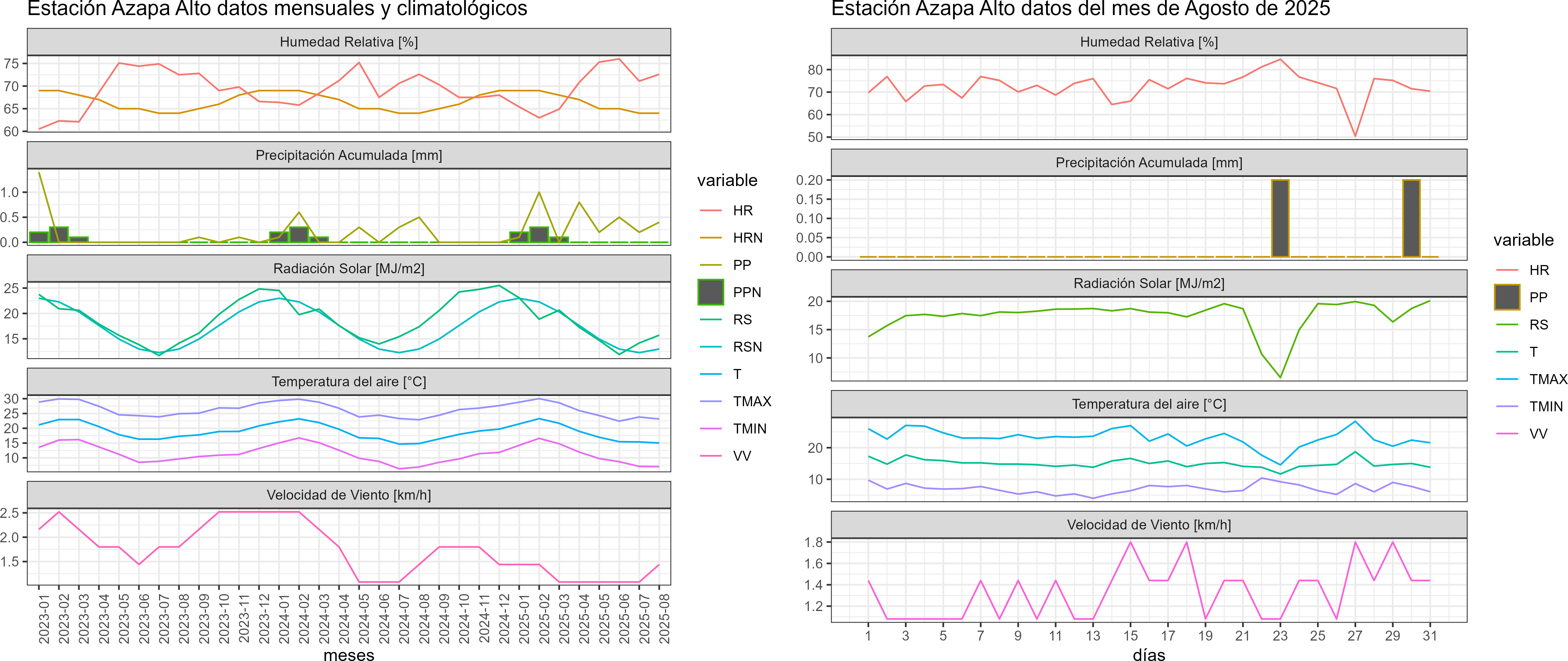 La estación Azapa Alto corresponde al distrito agroclimático 15-2. Para este distrito climático la temperatura mínima, media y máxima climatológicas alcanzan los 7.8°C, 16.3°C y 24.9°C respectivamente. Por su parte, respecto a las temperaturas medidas durante el mes de agosto en la estación: la temperatura mínima alcanzo los 7°C (-0.8°C bajo la climatológica), la temperatura media 15°C (-1.3°C bajo la climatológica) y la temperatura máxima llegó a los 23.1°C (-1.8°C bajo la climatológica). En el mes de agosto se registró una pluviometría de 0.4 mm, lo cual representa un superávit de más de un 100% De enero a agosto se ha registrado un total acumulado de 3.2 mm, en circunstancias que un año normal registraría a la fecha 9 mm, lo que representa un déficit de 64.4%. A la misma fecha, durante el año 2024 la precipitación alcanzaba los 0.5 mm.