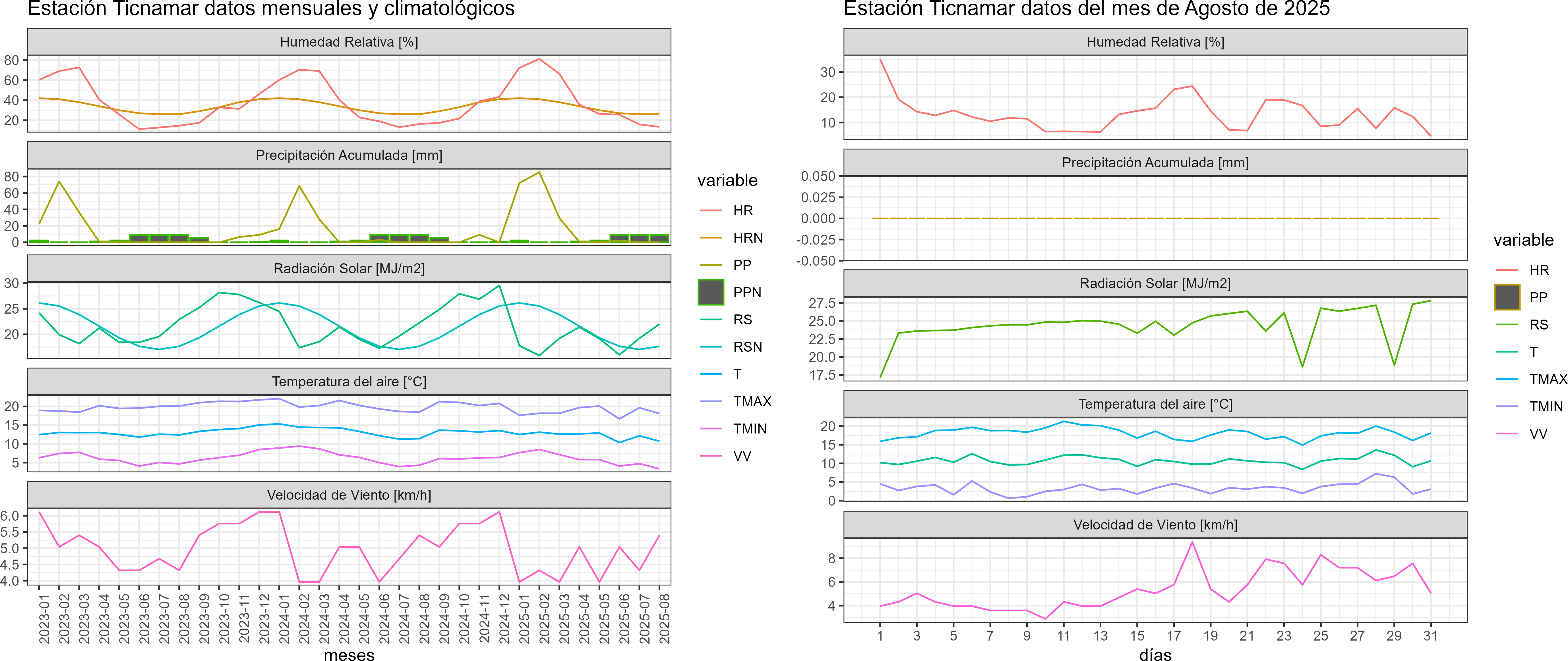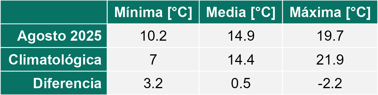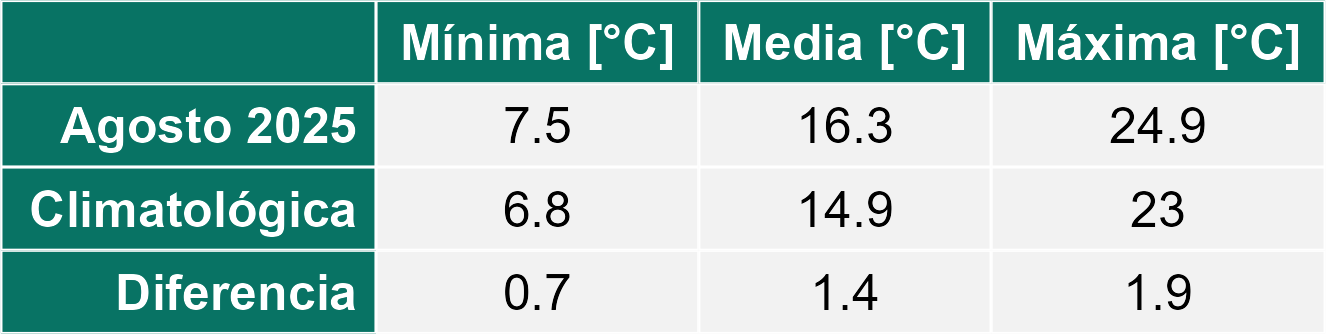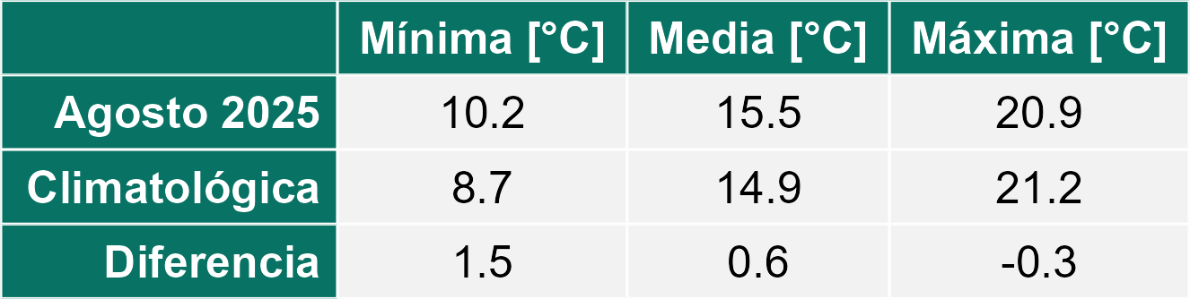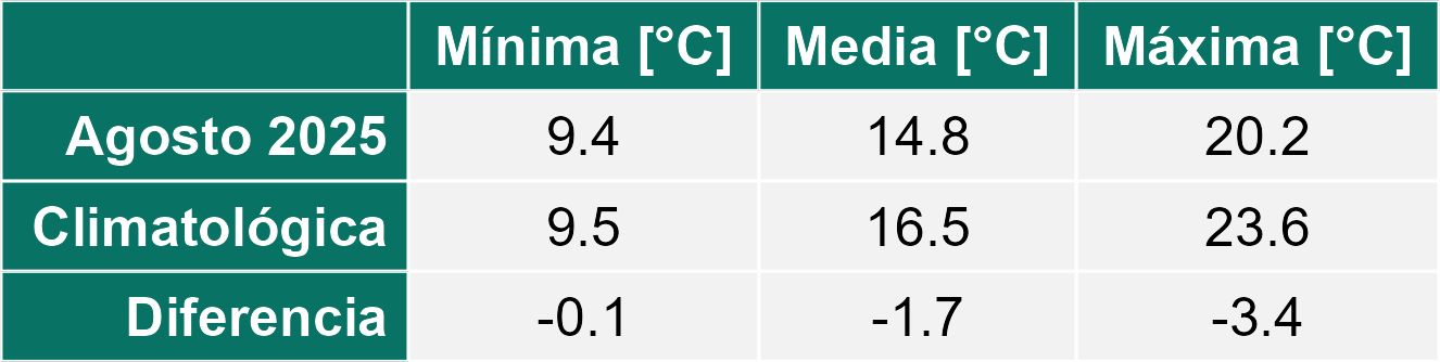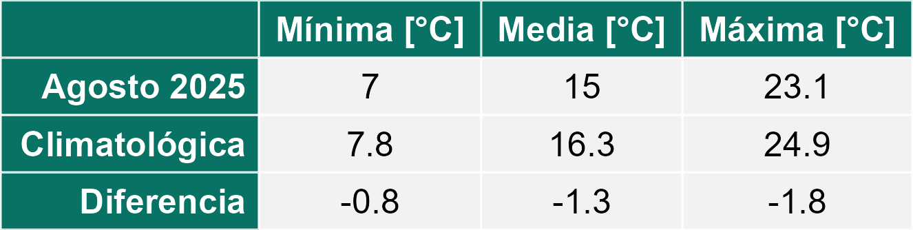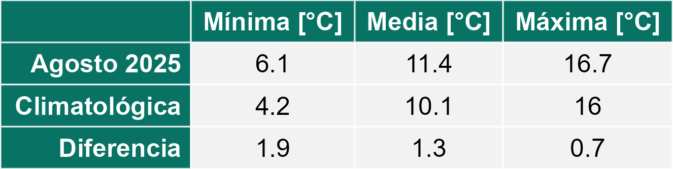 La estación Ticnamar corresponde al distrito agroclimático 15-3-4. Para este distrito climático la temperatura mínima, media y máxima climatológicas alcanzan los 3.2°C, 8.9°C y 14.6°C respectivamente. Por su parte, respecto a las temperaturas medidas durante el mes de agosto en la estación: la temperatura mínima alcanzo los 3.4°C (0.2°C sobre la climatológica), la temperatura media 10.7°C (1.8°C sobre la climatológica) y la temperatura máxima llegó a los 18.1°C (3.5°C sobre la climatológica). En el mes de agosto se registró una pluviometría de 0 mm, lo cual representa un 0% con respecto al mismo mes de un año normal. De enero a agosto se ha registrado un total acumulado de 189.4 mm, en circunstancias que un año normal registraría a la fecha 205 mm, lo que representa un déficit de 7.6%. A la misma fecha, durante el año 2024 la precipitación alcanzaba los 0 mm.