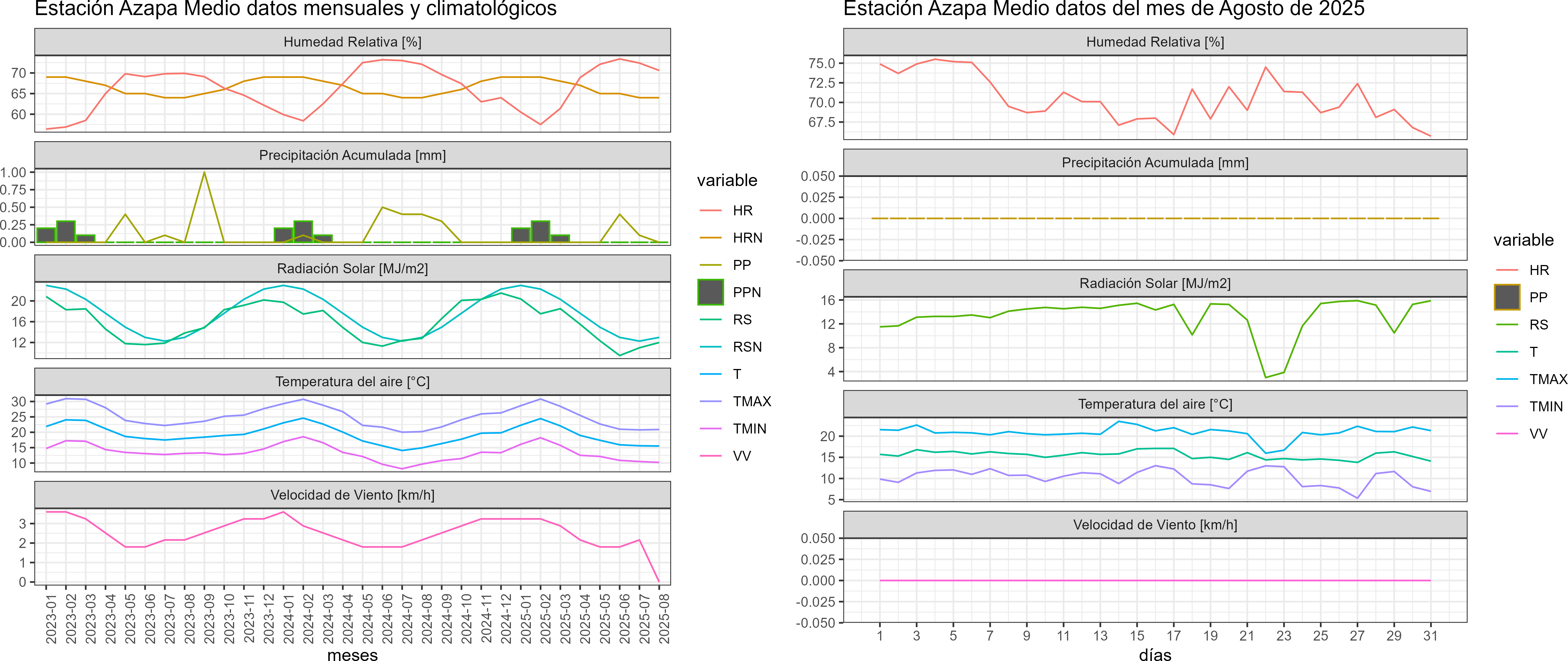 La estación Azapa Medio corresponde al distrito agroclimático 15-2. Para este distrito climático la temperatura mínima, media y máxima climatológicas alcanzan los 8.7°C, 14.9°C y 21.2°C respectivamente. Por su parte, respecto a las temperaturas medidas durante el mes de agosto en la estación: la temperatura mínima alcanzo los 10.2°C (1.5°C sobre la climatológica), la temperatura media 15.5°C (0.6°C sobre la climatológica) y la temperatura máxima llegó a los 20.9°C (-0.3°C bajo la climatológica). En el mes de agosto se registró una pluviometría de 0 mm. De enero a agosto se ha registrado un total acumulado de 0.5 mm, en circunstancias que un año normal registraría a la fecha 45 mm, lo que representa un déficit de 98.9%. A la misma fecha, durante el año 2024 la precipitación alcanzaba los 0.4 mm.