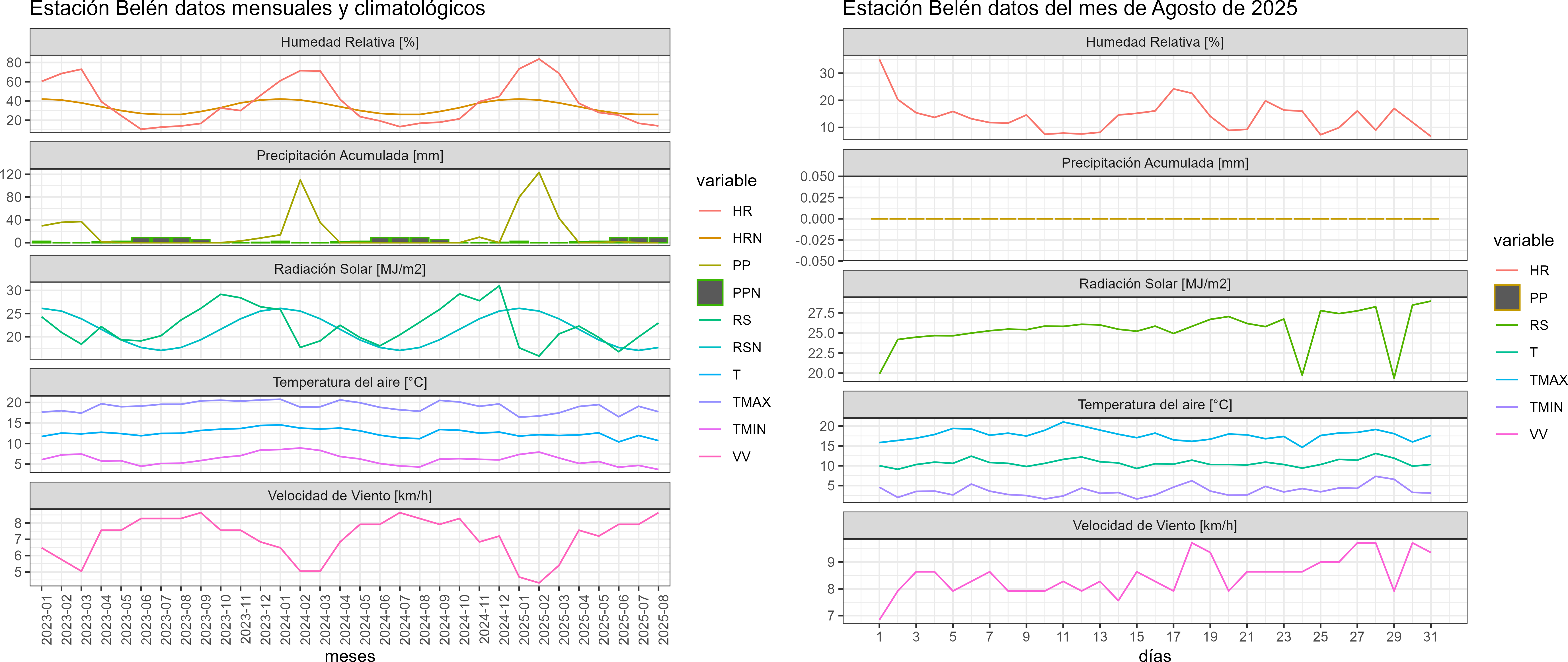 La estación Belén corresponde al distrito agroclimático 15-3-4. Para este distrito climático la temperatura mínima, media y máxima climatológicas alcanzan los 4.1°C, 10°C y 15.9°C respectivamente. Por su parte, respecto a las temperaturas medidas durante el mes de agosto en la estación: la temperatura mínima alcanzo los 3.7°C (-0.4°C bajo la climatológica), la temperatura media 10.7°C (0.7°C sobre la climatológica) y la temperatura máxima llegó a los 17.7°C (1.8°C sobre la climatológica). En el mes de agosto se registró una pluviometría de 0 mm, lo cual representa un 0% con respecto al mismo mes de un año normal. De enero a agosto se ha registrado un total acumulado de 248.4 mm, en circunstancias que un año normal registraría a la fecha 217 mm, lo que representa un superávit de 14.5%. A la misma fecha, durante el año 2024 la precipitación alcanzaba los 0 mm.