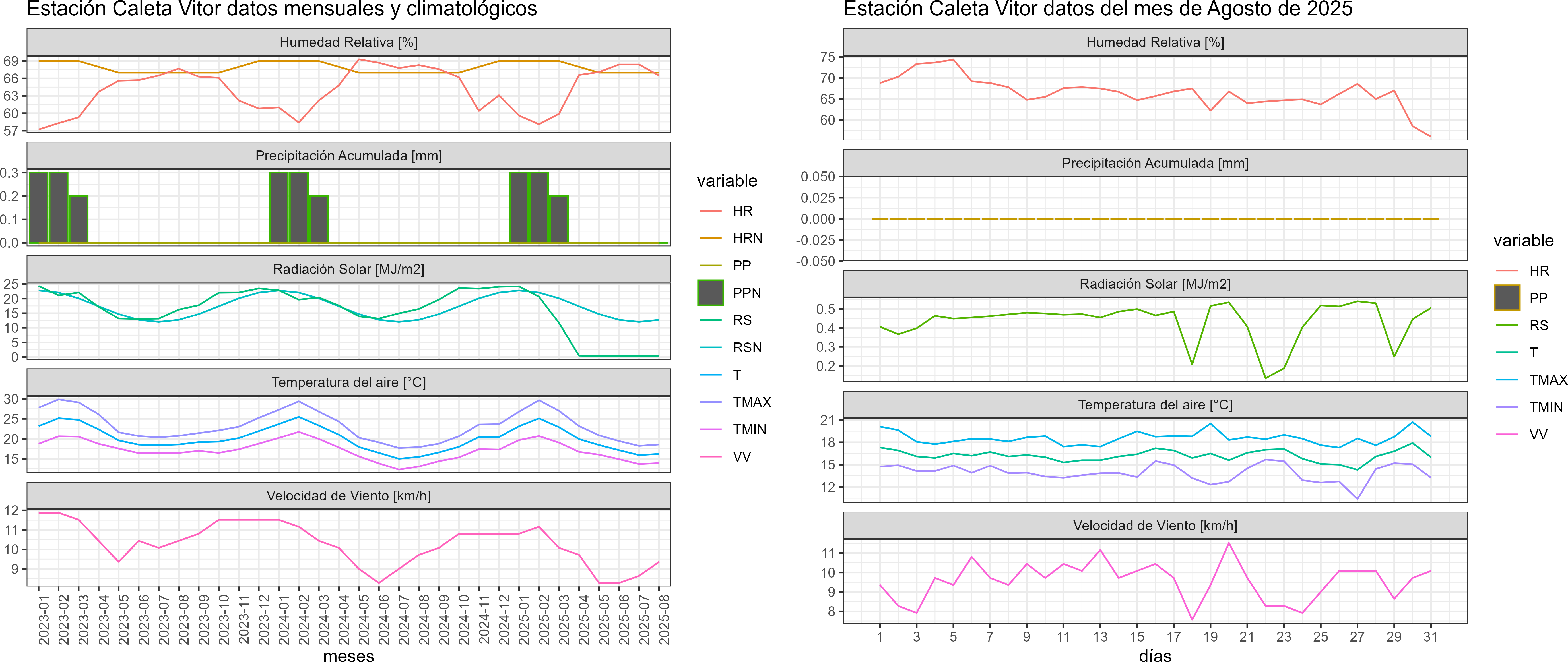 La estación Caleta Vitor corresponde al distrito agroclimático 15-1. Para este distrito climático la temperatura mínima, media y máxima climatológicas alcanzan los 10°C, 13.7°C y 17.4°C respectivamente. Por su parte, respecto a las temperaturas medidas durante el mes de agosto en la estación: la temperatura mínima alcanzo los 13.9°C (3.9°C sobre la climatológica), la temperatura media 16.2°C (2.5°C sobre la climatológica) y la temperatura máxima llegó a los 18.6°C (1.2°C sobre la climatológica). En el mes de agosto se registró una pluviometría de 0 mm. De enero a agosto se ha registrado un total acumulado de 0 mm, en circunstancias que un año normal registraría a la fecha 0 mm. A la misma fecha, durante el año 2024 la precipitación alcanzaba los 0 mm.