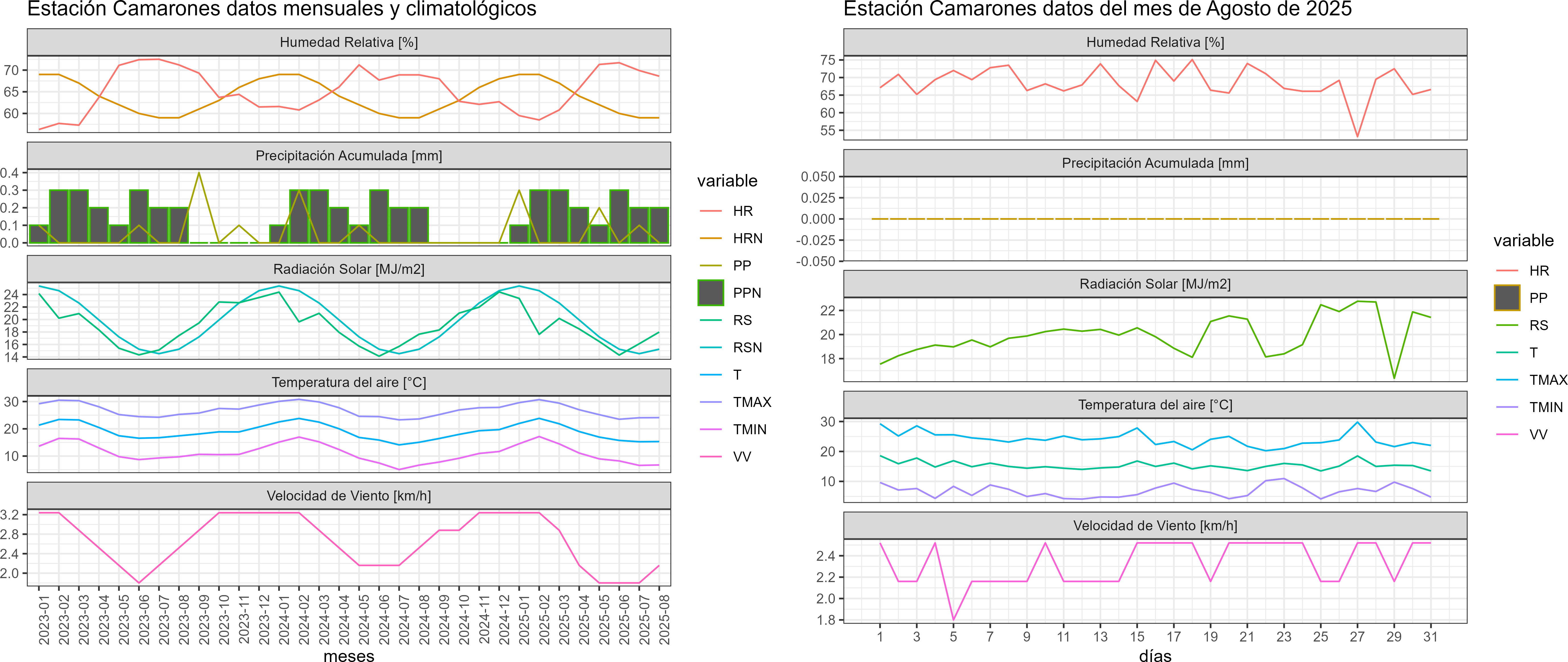 La estación Camarones corresponde al distrito agroclimático 15-3-2. Para este distrito climático la temperatura mínima, media y máxima climatológicas alcanzan los 7.6°C, 17.2°C y 26.8°C respectivamente. Por su parte, respecto a las temperaturas medidas durante el mes de agosto en la estación: la temperatura mínima alcanzo los 6.7°C (-0.9°C bajo la climatológica), la temperatura media 15.3°C (-1.9°C bajo la climatológica) y la temperatura máxima llegó a los 24.1°C (-2.7°C bajo la climatológica). En el mes de agosto se registró una pluviometría de 0 mm, lo cual representa un 0% con respecto al mismo mes de un año normal. De enero a agosto se ha registrado un total acumulado de 0.6 mm, en circunstancias que un año normal registraría a la fecha 2 mm, lo que representa un déficit de 70%. A la misma fecha, durante el año 2024 la precipitación alcanzaba los 0 mm.