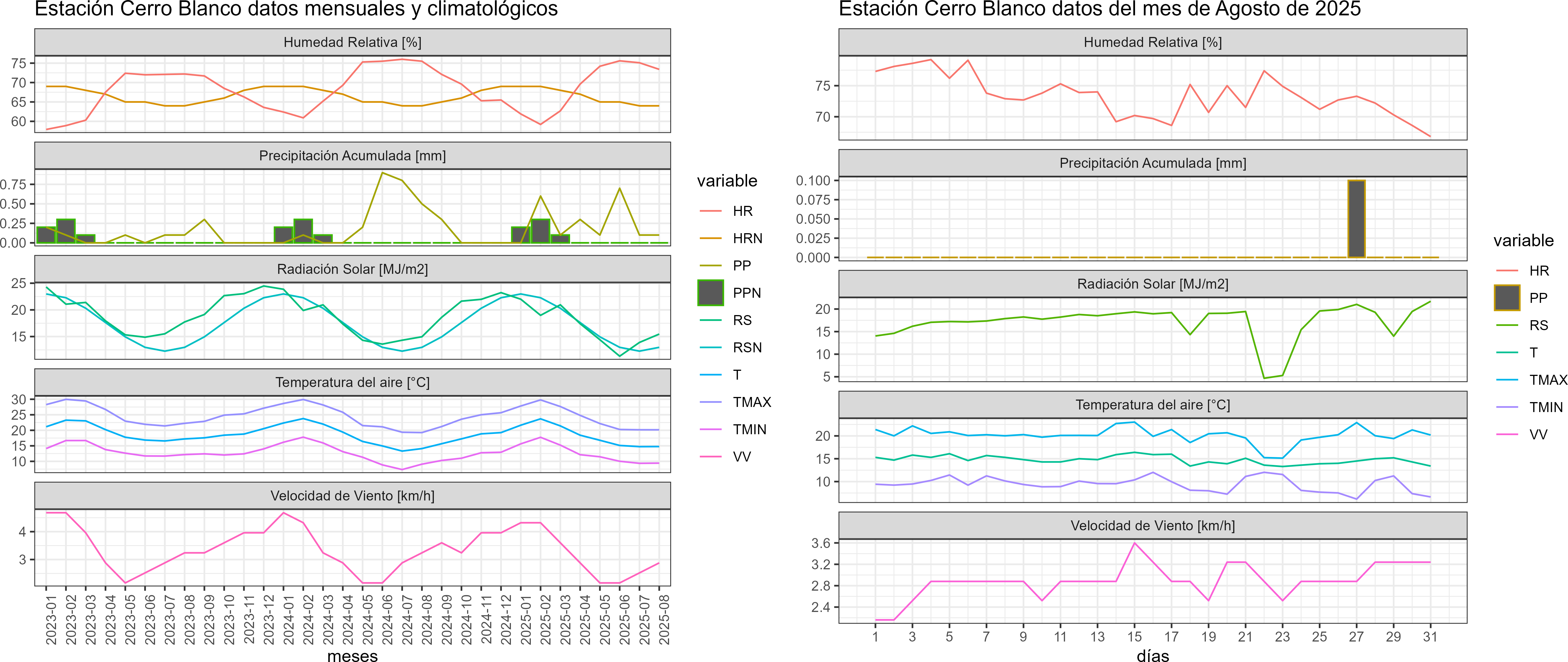La estación Cerro Blanco corresponde al distrito agroclimático 15-2. Para este distrito climático la temperatura mínima, media y máxima climatológicas alcanzan los 9.5°C, 16.5°C y 23.6°C respectivamente. Por su parte, respecto a las temperaturas medidas durante el mes de agosto en la estación: la temperatura mínima alcanzo los 9.4°C (-0.1°C bajo la climatológica), la temperatura media 14.8°C (-1.7°C bajo la climatológica) y la temperatura máxima llegó a los 20.2°C (-3.4°C bajo la climatológica). En el mes de agosto se registró una pluviometría de 0.1 mm, lo cual representa un superávit de más de un 100% De enero a agosto se ha registrado un total acumulado de 2 mm, en circunstancias que un año normal registraría a la fecha 11 mm, lo que representa un déficit de 81.8%. A la misma fecha, durante el año 2024 la precipitación alcanzaba los 0.5 mm.