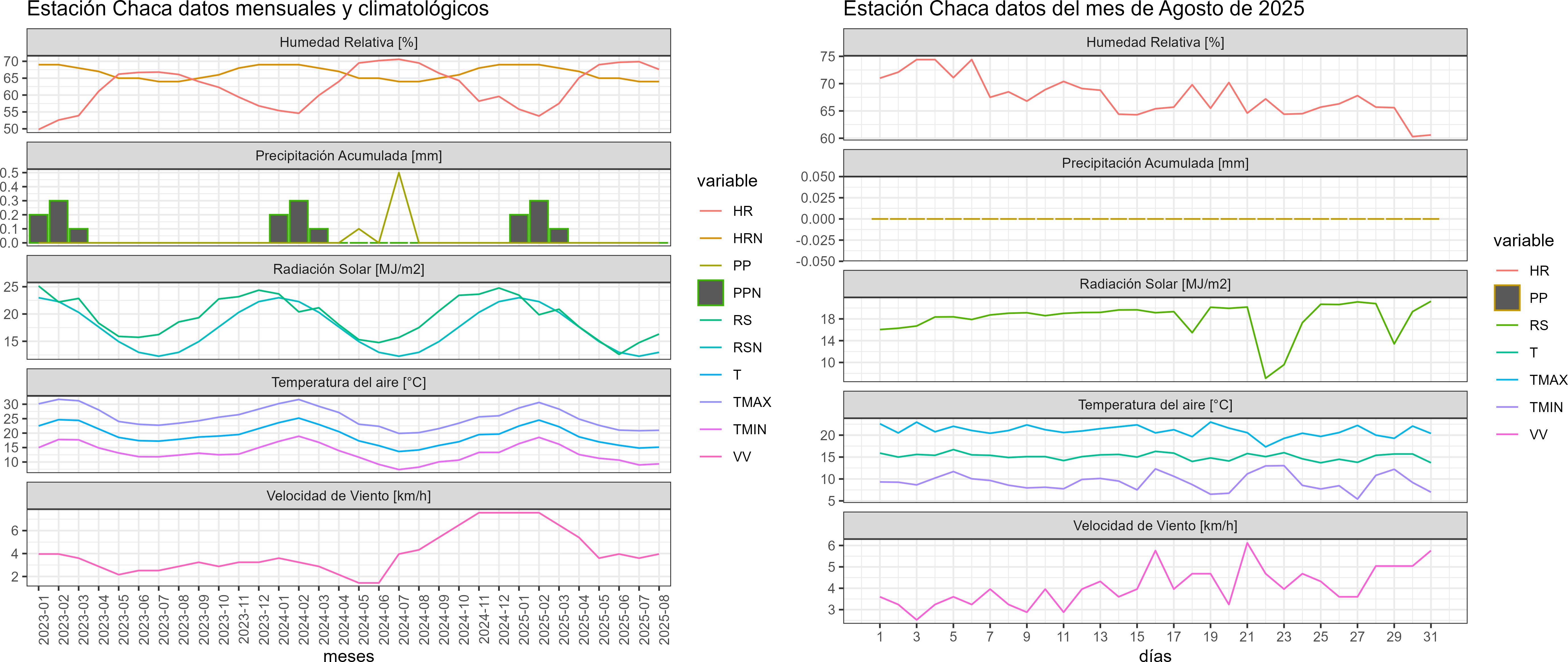 La estación Chaca corresponde al distrito agroclimático 15-2. Para este distrito climático la temperatura mínima, media y máxima climatológicas alcanzan los 10.8°C, 16.6°C y 22.5°C respectivamente. Por su parte, respecto a las temperaturas medidas durante el mes de agosto en la estación: la temperatura mínima alcanzo los 9.3°C (-1.5°C bajo la climatológica), la temperatura media 15.1°C (-1.5°C bajo la climatológica) y la temperatura máxima llegó a los 21°C (-1.5°C bajo la climatológica). En el mes de agosto se registró una pluviometría de 0 mm. De enero a agosto se ha registrado un total acumulado de 0 mm, en circunstancias que un año normal registraría a la fecha 0 mm. A la misma fecha, durante el año 2024 la precipitación alcanzaba los 0 mm.