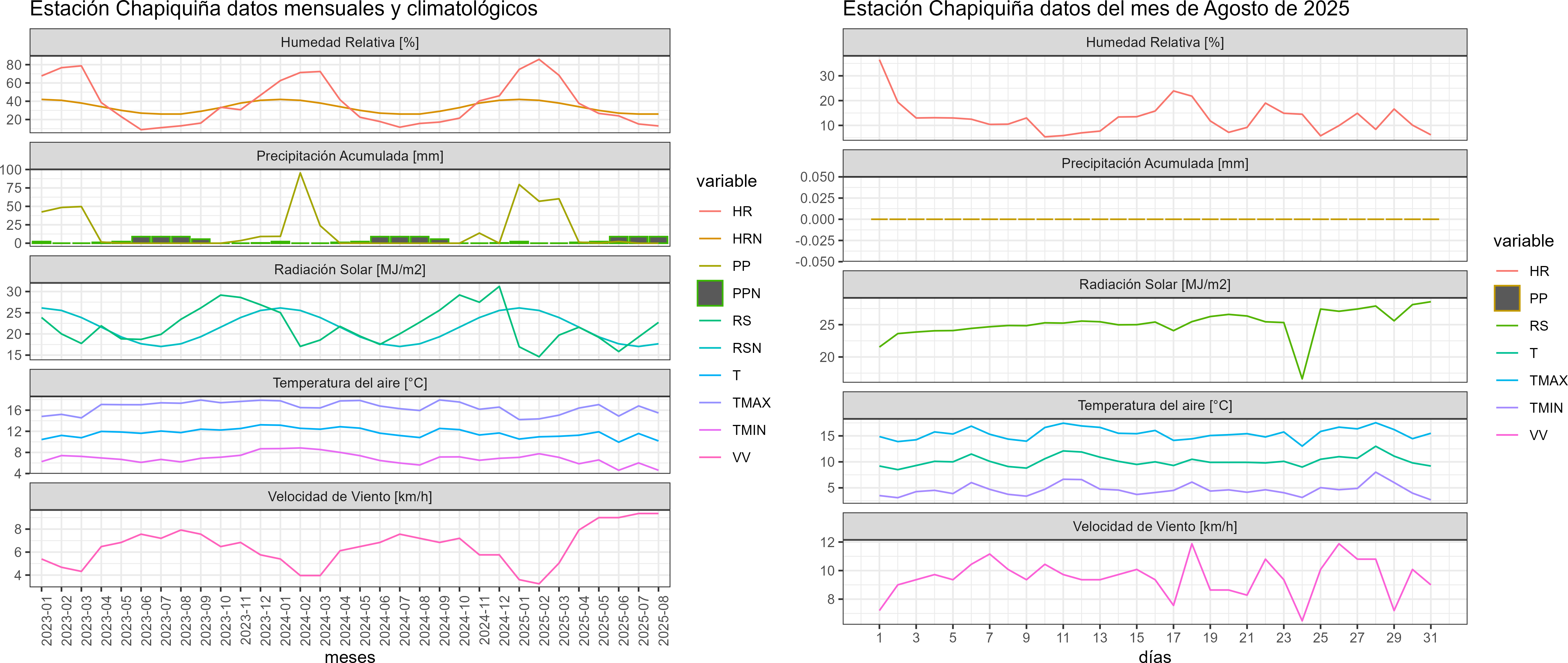 La estación Chapiquiña corresponde al distrito agroclimático 15-3-4. Para este distrito climático la temperatura mínima, media y máxima climatológicas alcanzan los -1.7°C, 4.9°C y 11.4°C respectivamente. Por su parte, respecto a las temperaturas medidas durante el mes de agosto en la estación: la temperatura mínima alcanzo los 4.6°C (6.3°C sobre la climatológica), la temperatura media 10.2°C (5.3°C sobre la climatológica) y la temperatura máxima llegó a los 15.5°C (4.1°C sobre la climatológica). En el mes de agosto se registró una pluviometría de 0 mm, lo cual representa un 0% con respecto al mismo mes de un año normal. De enero a agosto se ha registrado un total acumulado de 200.7 mm, en circunstancias que un año normal registraría a la fecha 304 mm, lo que representa un déficit de 34%. A la misma fecha, durante el año 2024 la precipitación alcanzaba los 0 mm.