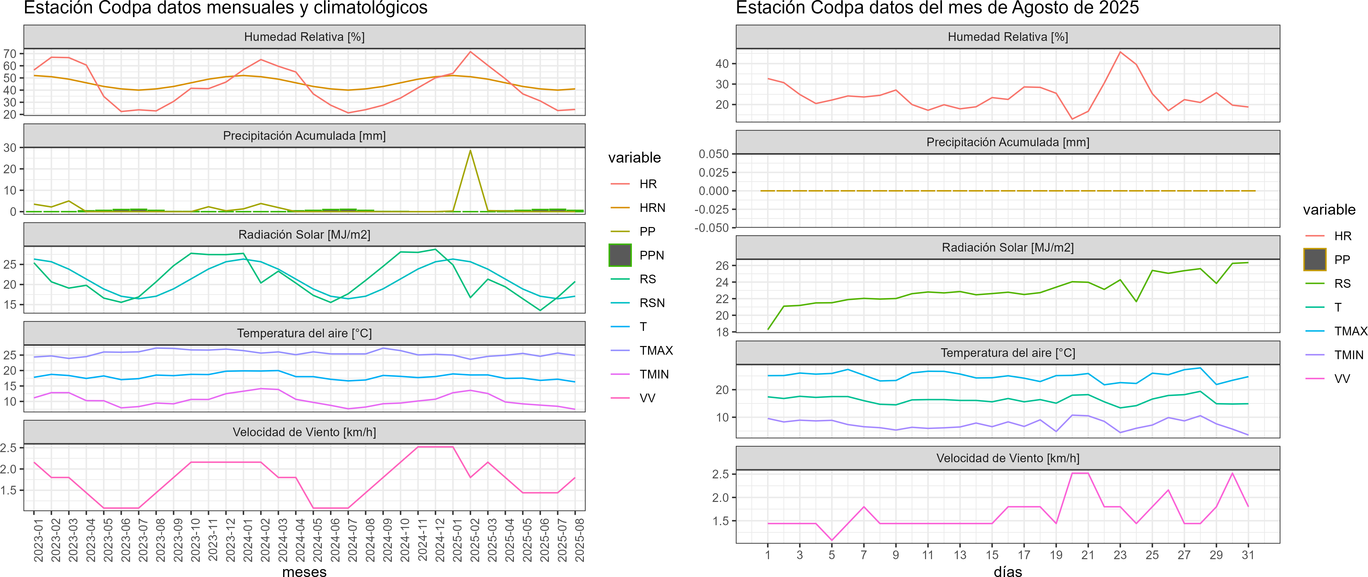 La estación Codpa corresponde al distrito agroclimático 15-3-3. Para este distrito climático la temperatura mínima, media y máxima climatológicas alcanzan los 6.8°C, 14.9°C y 23°C respectivamente. Por su parte, respecto a las temperaturas medidas durante el mes de agosto en la estación: la temperatura mínima alcanzo los 7.5°C (0.7°C sobre la climatológica), la temperatura media 16.3°C (1.4°C sobre la climatológica) y la temperatura máxima llegó a los 24.9°C (1.9°C sobre la climatológica). En el mes de agosto se registró una pluviometría de 0 mm, lo cual representa un 0% con respecto al mismo mes de un año normal. De enero a agosto se ha registrado un total acumulado de 29.7 mm, en circunstancias que un año normal registraría a la fecha 56 mm, lo que representa un déficit de 47%. A la misma fecha, durante el año 2024 la precipitación alcanzaba los 0 mm.