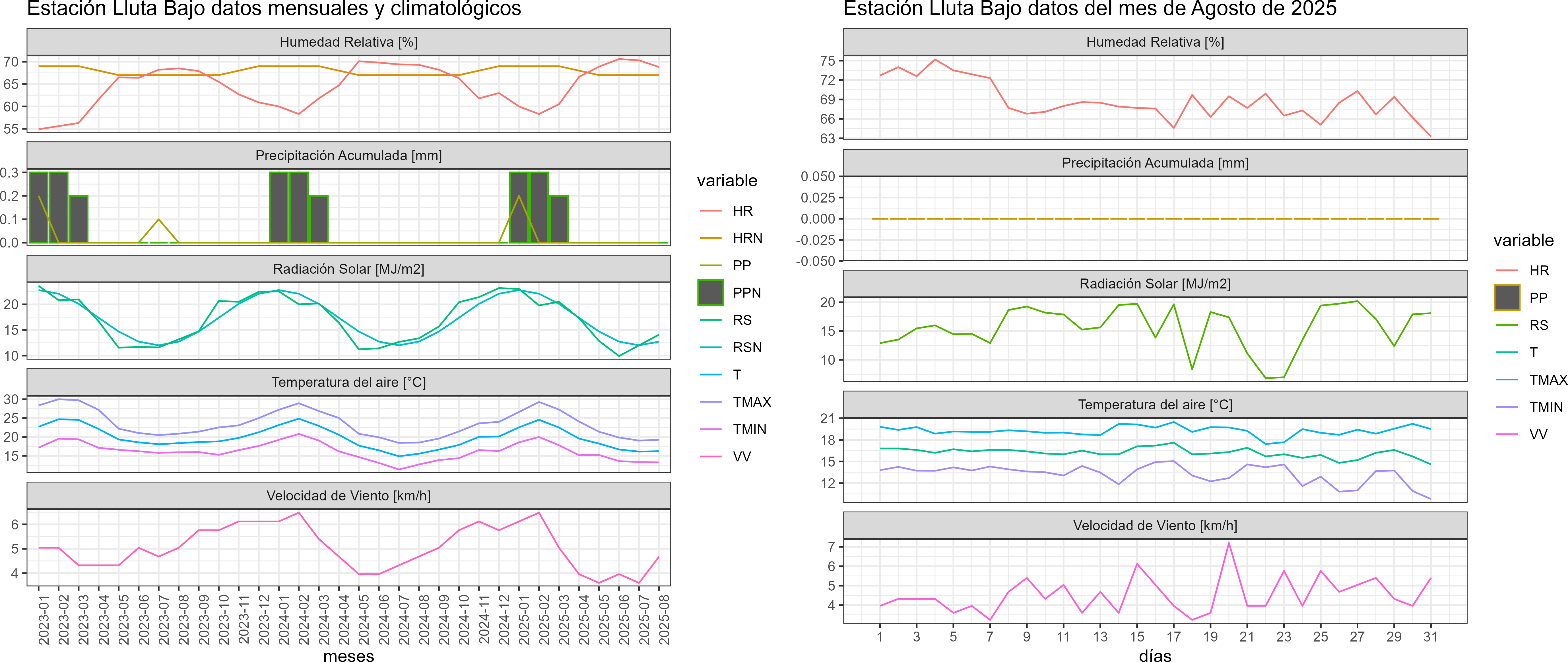 La estación Lluta Bajo corresponde al distrito agroclimático 15-1. Para este distrito climático la temperatura mínima, media y máxima climatológicas alcanzan los 12.5°C, 15.7°C y 18.9°C respectivamente. Por su parte, respecto a las temperaturas medidas durante el mes de agosto en la estación: la temperatura mínima alcanzo los 13.3°C (0.8°C sobre la climatológica), la temperatura media 16.2°C (0.5°C sobre la climatológica) y la temperatura máxima llegó a los 19.3°C (0.4°C sobre la climatológica). En el mes de agosto se registró una pluviometría de 0 mm. De enero a agosto se ha registrado un total acumulado de 0.2 mm, en circunstancias que un año normal registraría a la fecha 69 mm, lo que representa un déficit de 99.7%. A la misma fecha, durante el año 2024 la precipitación alcanzaba los 0 mm.