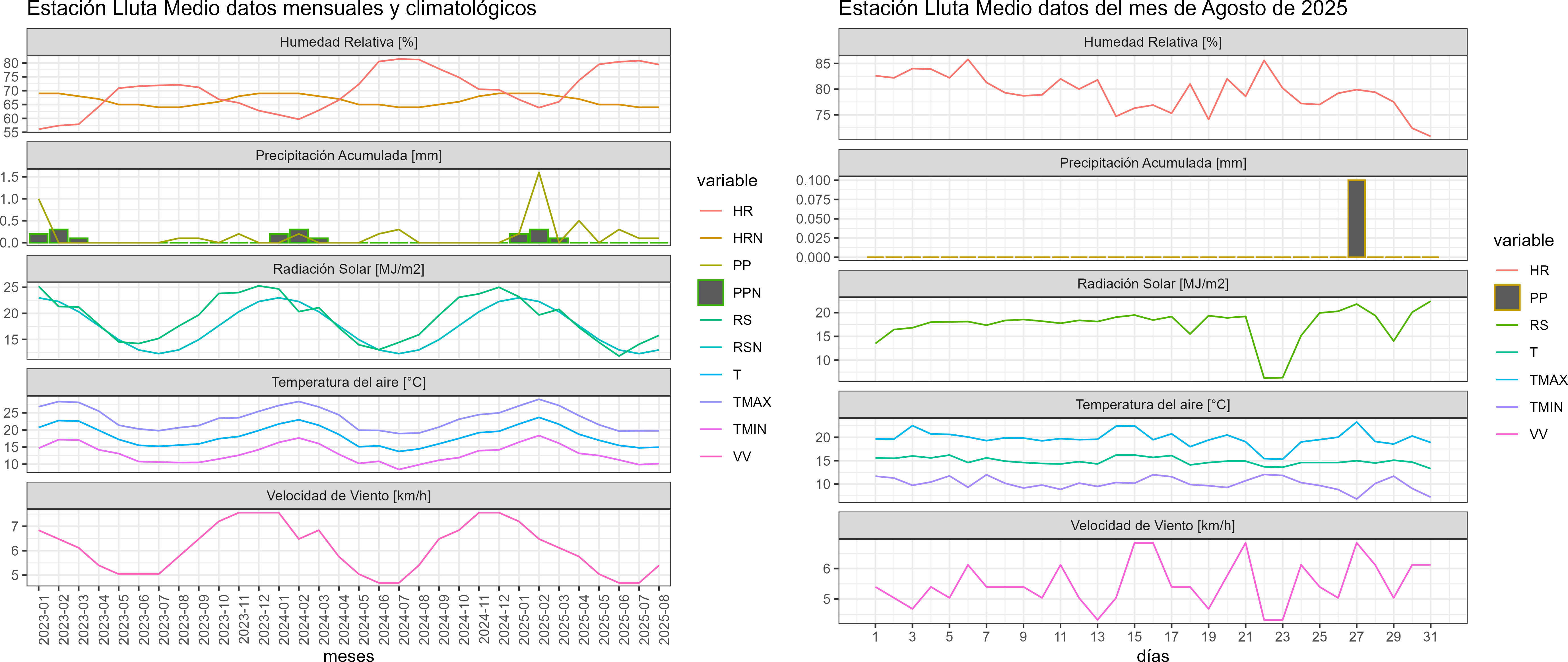La estación Lluta Medio corresponde al distrito agroclimático 15-2. Para este distrito climático la temperatura mínima, media y máxima climatológicas alcanzan los 7°C, 14.4°C y 21.9°C respectivamente. Por su parte, respecto a las temperaturas medidas durante el mes de agosto en la estación: la temperatura mínima alcanzo los 10.2°C (3.2°C sobre la climatológica), la temperatura media 14.9°C (0.5°C sobre la climatológica) y la temperatura máxima llegó a los 19.7°C (-2.2°C bajo la climatológica). En el mes de agosto se registró una pluviometría de 0.1 mm, lo cual representa un superávit de más de un 100% De enero a agosto se ha registrado un total acumulado de 2.8 mm, en circunstancias que un año normal registraría a la fecha 40 mm, lo que representa un déficit de 93%. A la misma fecha, durante el año 2024 la precipitación alcanzaba los 0 mm.